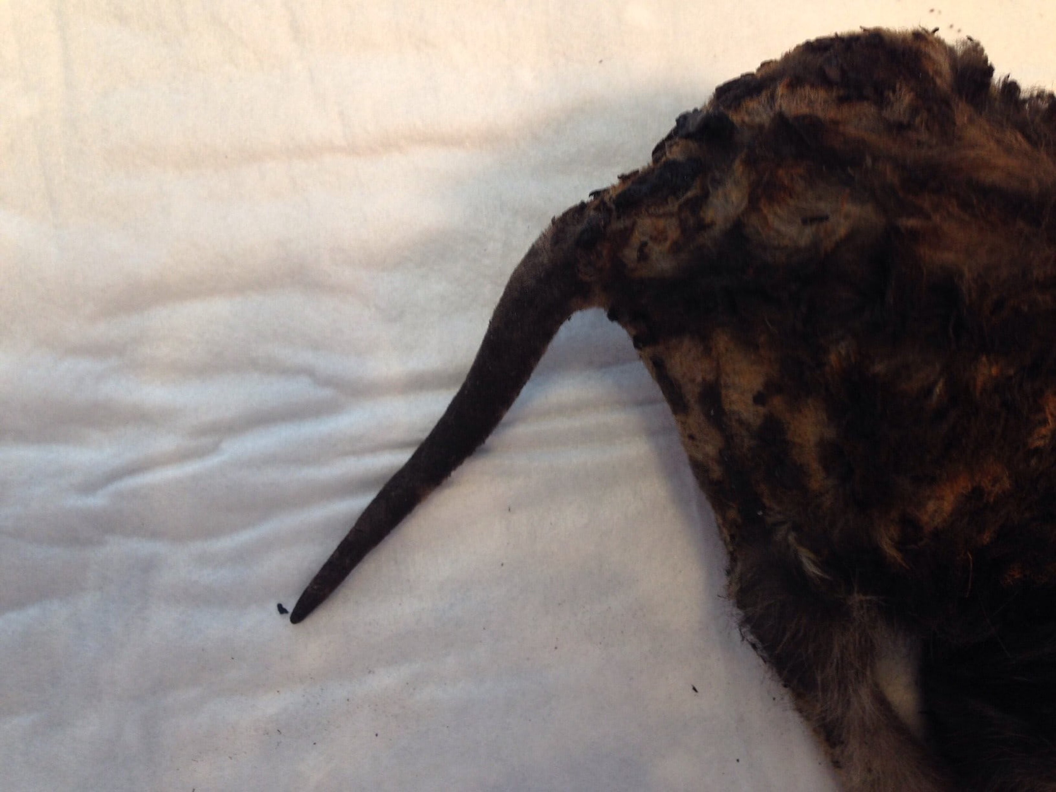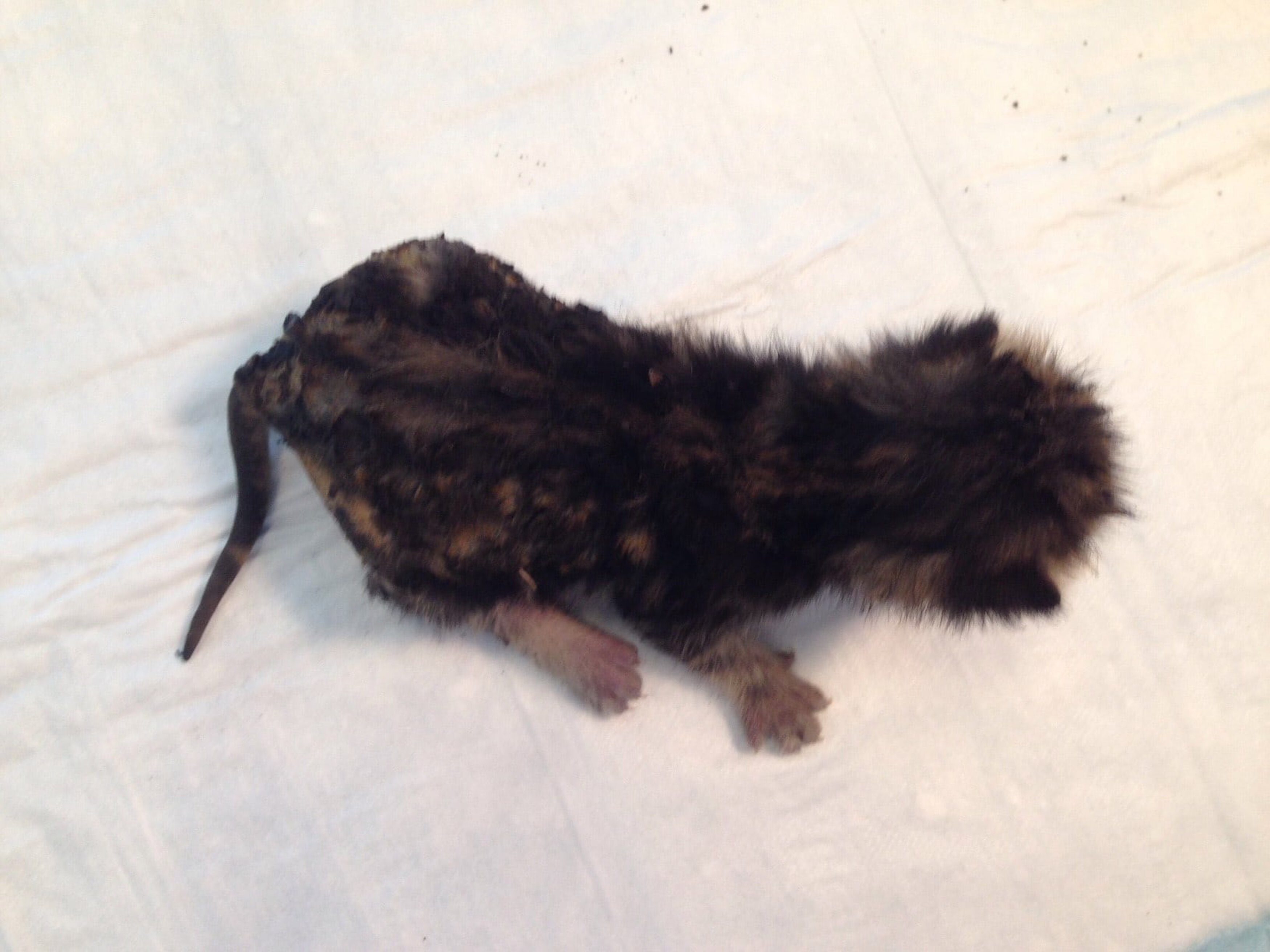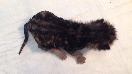 Die Polizei, die den Tod der zwei Welpen bestätigte, informierte die Tierrettung München e.V. Uns bot sich ein Bild des Jammers: dem verbliebenen lebenden Katzenwelpen, 170 g leicht, war ein Großteil der hinteren Körperhälfte angesengt, der Schwanz gar komplett verkohlt und nicht mehr vital. Wir versorgten das Kätzchen mit Schmerzmitteln und Infusion und transportierten es in die Chirurgische und Gynäkologische Tierklinik der LMU, wo es weiter versorgt wurde.
