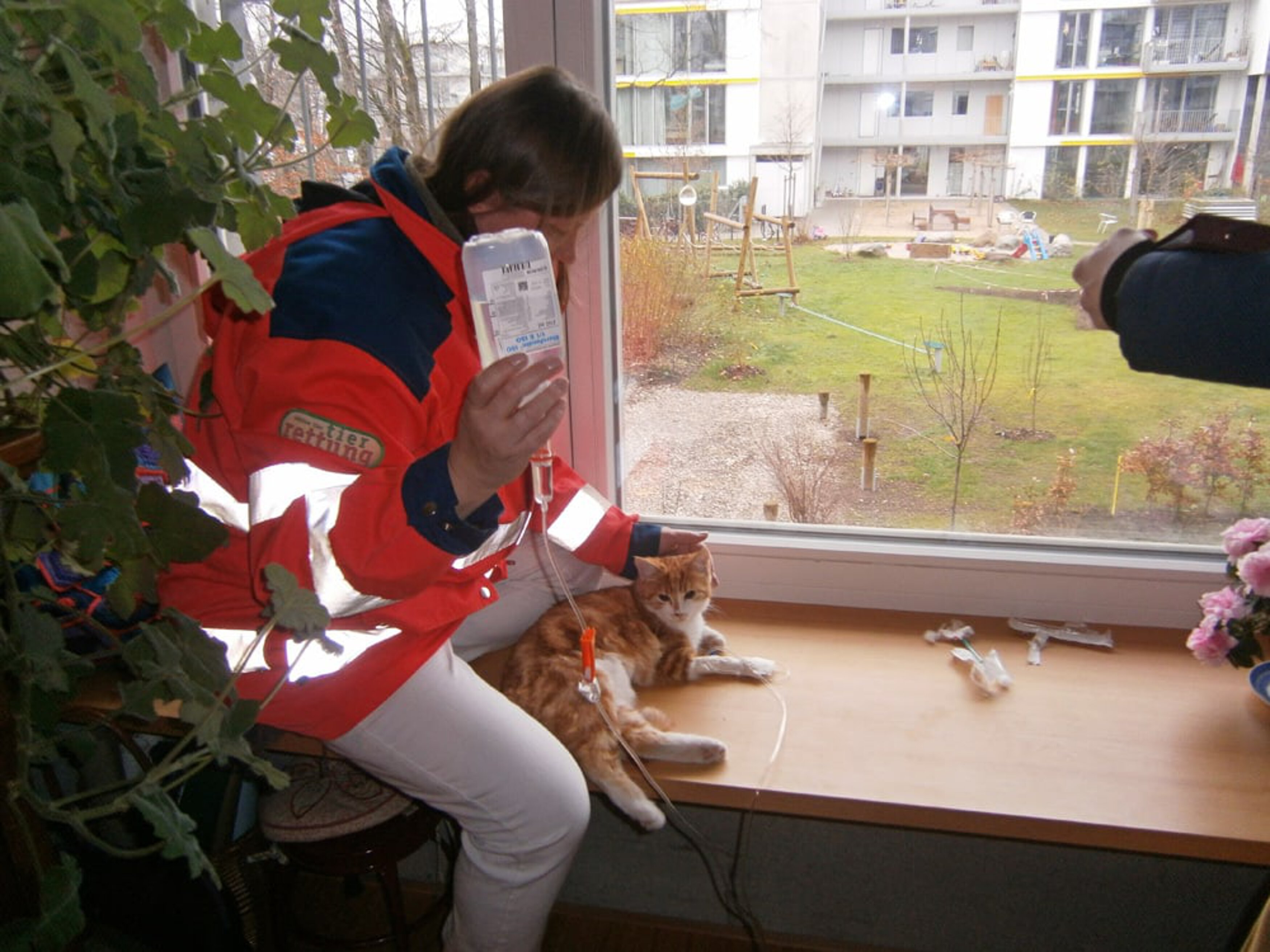 Zu zweit machen sich unsere diensthabenden Tierärzte (Dr. Gabor Horvath und seine Frau Malgorzata Horvath) sofort auf den Weg. Innerhalb von zehn Minuten erreichen sie den Einsatzort in der Petra-Kelly-Straße. In der Zwischenzeit hatte sich Luna mit großer Mühe eine Etage nach oben geschleppt. Als die beiden Veterinäre zu dem Kätzchen gelangen, liegt sie apathisch und in Brust-Seitenlage in einem Weidenkörbchen. Sie zittert leicht. Das kleine Tier erweist sich als sehr lieb und lässt sich bereitwillig untersuchen. Nur ihr rechtes Bein dürfen die beiden Tierärzte nicht berühren. Sie stellen eine erhöhte Herzund Atemfrequenz fest, die auf große Schmerzen und einen beginnenden Schock hindeuten. Die OP-Wunde ist reizlos, der Bauch weich und unauffällig. Um dem Schockzustand entgegenzuwirken, verabreichen die Horvaths als erstes ein starkes und schnell wirkendes Schmerzmittel und schließen das Tier an eine Infusion an. Erst nachdem das Schmerzmittel seine Wirkung entfaltet hat, lässt das Kätzchen die Untersuchung ihres Beines zu. Ein eindeutiger Bruch ist nicht zu ertasten, aber die Schmerzhaftigkeit und die Asymmetrie lassen auf eine Luxation oder Fraktur schließen, was nur in der Klinik mit einer Röntgenaufnahme abgeklärt werden kann, mit der auch innere Verletzungen ausgeschlossen werden können. Die beiden Tierärzte setzen die kleine Katze in den Sauerstoffkäfig und transportieren sie so, unter Sauerstoffgabe aus der tragbaren Sauerstoffflasche und mit Dauertropfinfusion, zum Einsatzfahrzeug. Dann geht es mit dem Besitzer in die nächste Tierklinik (Chirurgische Kleintierklinik der LMU München). Zum Glück gibt es auf der Übersichtsröntgenaufnahme keinen Hinweis auf innere Verletzungen. Es wird eine Oberschenkelfraktur in Knienähe festgestellt, die operiert werden muss. Als Dr. Gabor Horvath am nächsten Tag das Kätzchen in der Klinik besucht, ist es bereits operiert und kann das Bein sogar schon wieder ein wenig belasten.