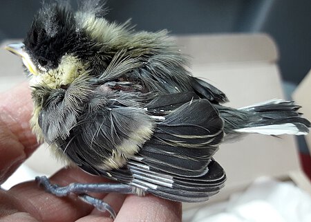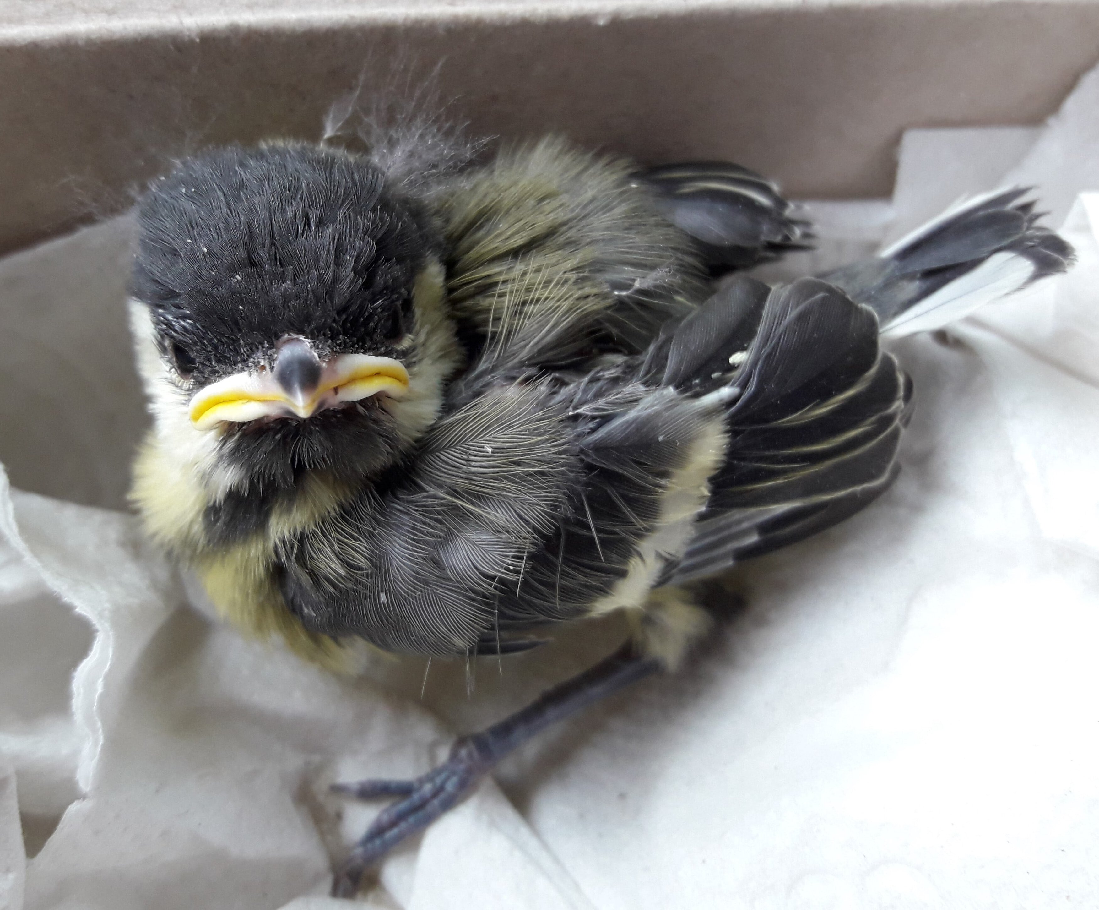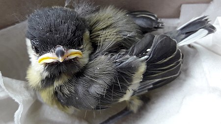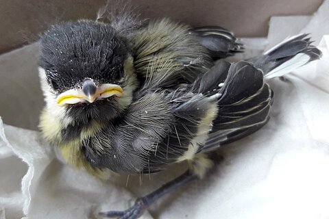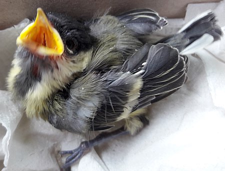 Da dieses Mal sowieso noch Unterlagen aus der Verwaltung abgeholt werden mussten, und wir auch gerade mit der Behandlung eines Vogelpatienten in der Dienststelle fertig geworden waren und gleich losfahren konnten, konnte der Findling ausnahmsweise im Büro gelassen werden. Eine klitzekleine mit Luftlöchern versehene Schachtel wartete auf mich. Wie sich rausstellte, handelte es sich bei dem Inhalt um eine kleine noch sehr junge Kohlmeise.