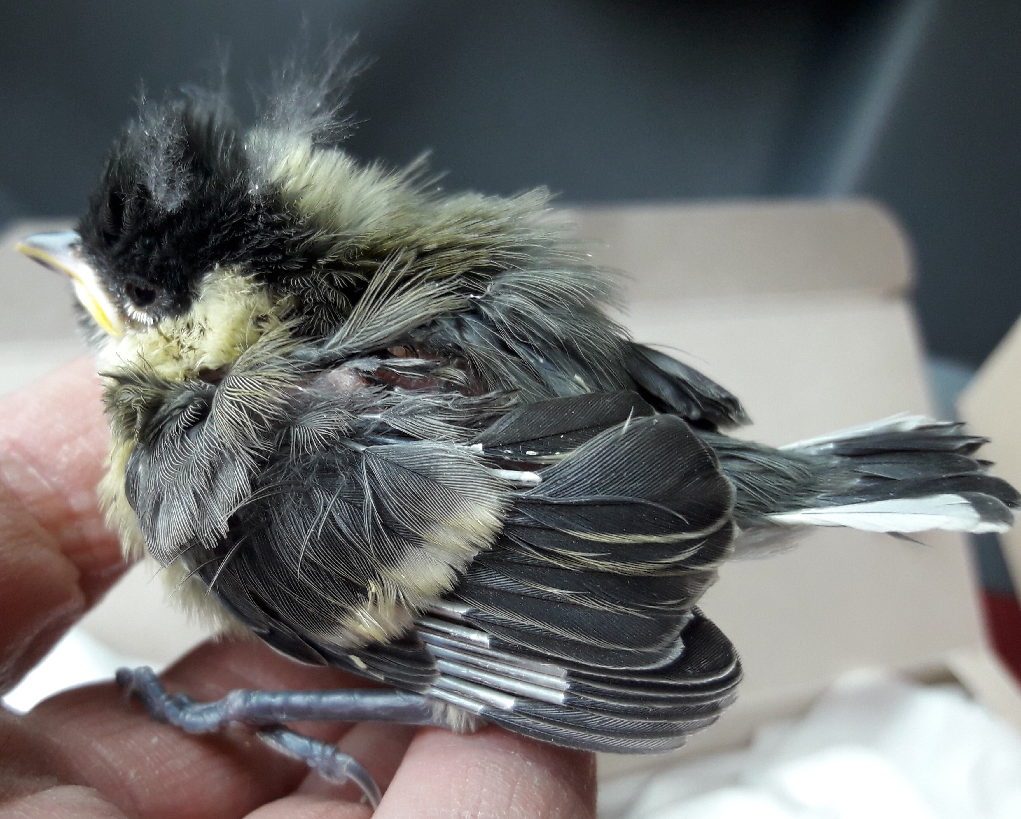 Die kleine Meise aus der Schachtel brauchte jedoch schon auf den ersten Blick Hilfe. Sie war sehr ruhig und geschwächt. Bei der gründlichen Untersuchung fiel mir eine sehr kleine frische Wunde auf der linken Seite, wo sie noch unbefiedert war, auf und eine kleine Hautverletzung am linken Flügel. Obwohl wir keine genauere Vorgeschichte hatten, war es sehr wahrscheinlich, dass sich das Tierchen im Maul einer Katze befunden hat.