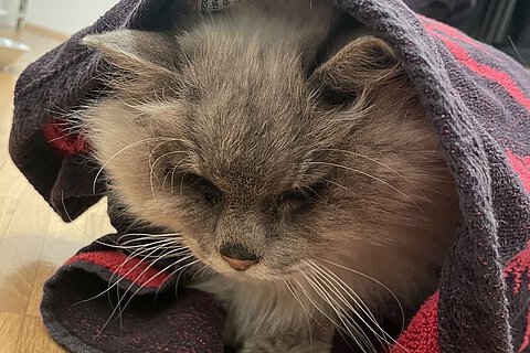 Am Einsatzort fanden wir einen stark unterkühlten, verfilzten Langhaarkater vor. Laut der Finder hatte er mit herzzerreißenden Schreien auf sich aufmerksam gemacht und nach seinem Einlass sofort einen Wassernapf leergetrunken. Trotzdem war er weiterhin dehydriert, und seine Körpertemperatur lag mit nur 34°C gefährlich niedrig. Es handelte sich um einen lebensbedrohlichen Notfall – die Finder hatten ihm buchstäblich das Leben gerettet. Sein Fell war großflächig verfilzt, seine Zähne in schlechtem Zustand, und sein Kreislauf schwach.