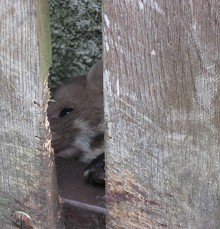 Trotz aller gesundheitlichen Risiken entschloss ich mich, ihn durch eine leichte Narkose ruhig zu stellen. Erhofft hatte ich mir, ihn so, mit Ziehen und Schieben, aus dieser Lage befreien zu können. Der Körper bewegte sich jedoch kein Bisschen, er war unter der Holzlatte regelrecht eingequetscht. Jetzt musste erneut gehandelt und zu „Plan B“ gegriffen werden: Die Gartentüre musste ausgehängt oder zumindest angehoben werden. Ein zwischenzeitlich herbeigeeilter handwerklich begabter Nachbar sah nur durch Herausklopfen der recht festsitzenden Bolzen der Türscharniere eine Möglichkeit, die Gartentüre etwas anzuheben und damit das kleine Wesen zu befreien.