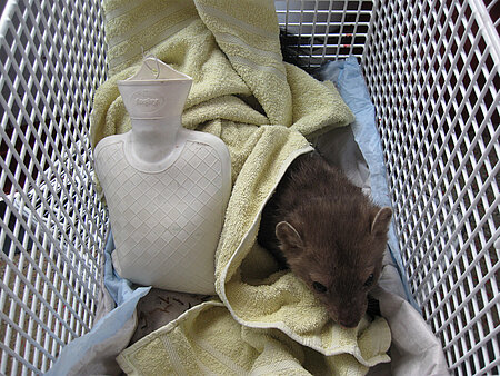 Die Befreiungsaktion lief ohne größere Probleme ab. Im Notarztwagen konnte der Zustand des kleinen Patienten nach weiterer, eingehender Untersuchung und Infusion-, Schmerz- und Schockbehandlung weiter stabilisiert werden. Es handelte sich um ein junges kräftiges Marder-Männchen mit auffallend gepflegtem Fell. Schon nach kurzer Zeit verbesserte sich der Zustand unseres Patienten derart erfreulich, dass er durchaus „bissig“ seine Kondition unter Beweis stellte. Auch für mich als erfahrene Tierärztin sind solche Erfolge immer wieder an Wunder grenzende Erlebnisse. Wie schade es um diesen kleinen Marder gewesen wäre, stellte er übrigens unter Beweis, als er, für seine Entlassung bereit, den Ort des Geschehens in einem solchen Tempo verließ, dass es nicht gelang, noch ein Erinnerungsfoto zu schießen.