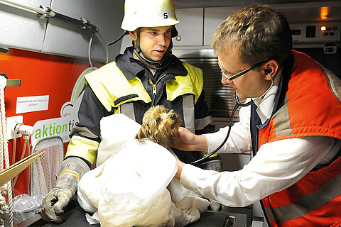 Die bei einem Brand entstehenden Reizgase können zu schweren Entzündungen in den Atemwegen führen mit der Folge, dass die Schleimhaut schwillt und entzündliche Flüssigkeit in die Lunge abgegeben wird, was zu schwerer Atemnot bis zum Tod führen kann. Aus diesem Grund verabreichte ich beiden Hunden entzündungshemmendes Cortison und ein Medikament, das die Atemwege erweitert. Wegen der beschriebenen möglichen Komplikationen, entschloss ich mich, die Tiere zur Überwachung in die Tierklinik zu bringen, wo sie weiter mit Sauerstoff und gegebenenfalls Infusionen versorgt werden konnten.