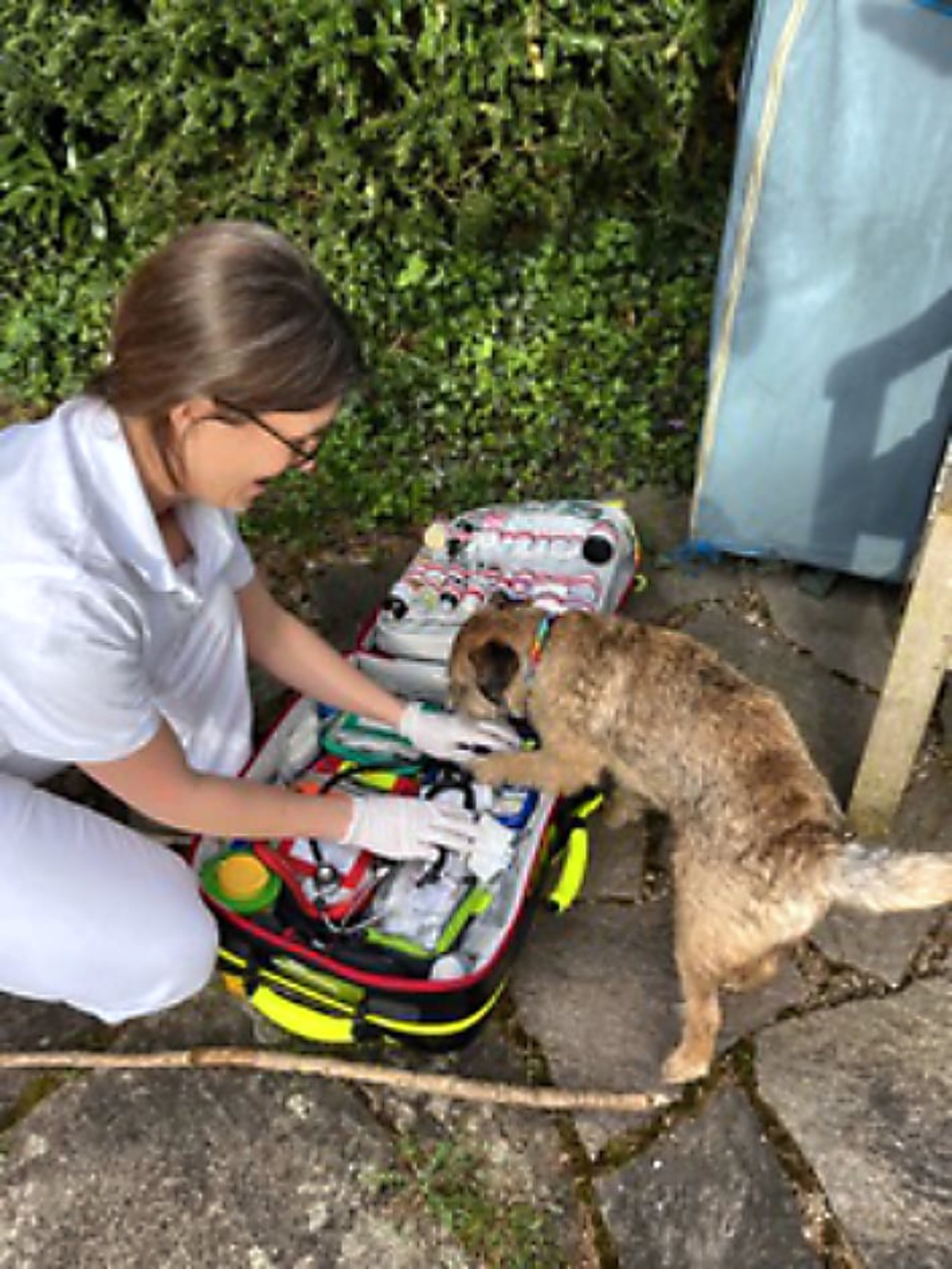 Vor Ort war der Hund wie jeder andere Welpe auch, fröhlich und verspielt. Nach einer allgemeinen Untersuchung bekam er ein Medikament unter die Haut gespritzt, welches Erbrechen auslöst. Innerhalb von fünf Minuten trat die Wirkung des Medikaments ein, und die Schokolade kam auf demselben Weg, wie sie rein ging, wieder raus. Nach mehrfachem produktivem Erbrechen wurde ein Gegenmittel gespritzt, und das Würgen ließ nach. Mit nun fast leerem Magen wurde Melk nachuntersucht, es wurde besonders auf die Herzfrequenz und die Schleimhäute geachtet und ihm eine intravenöse Infusion gelegt. Diese dient zum einen der Stabilisierung des Kreislaufs, der Rückführung von Flüssigkeit und zur besseren Ausscheidung des Toxins durch die Nieren. Während der Infusion durfte der nun etwas entkräftete Welpe sich auf dem Schoß der Besitzerin erholen. Nach 30 Minuten und regelmäßiger Kreislaufkontrolle wurde Melk wieder ganz der Alte, und man hätte meinen können, er hätte die Strapazen der letzten Stunde nie erlebt. Zu guter Letzt haben wir ihm noch flüssige Aktivkohle gegeben, um letzte Toxine im Magen-DarmTrakt zu binden und eine weitere Absorption zu verhindern. Gut, dass das alles im sonnigen Garten stattgefunden hat, sonst wäre es schon eine große Sauerei geworden. Für Melk war der Tag nun wieder wie er begonnen hatte; fröhlich, entspannt und mit jeder Menge Elan. Für seine Besitzerin war der Spuk noch nicht ganz vorbei, die nächsten zwei bis drei Stunden sollte sie ihren Hund noch gut beobachten.