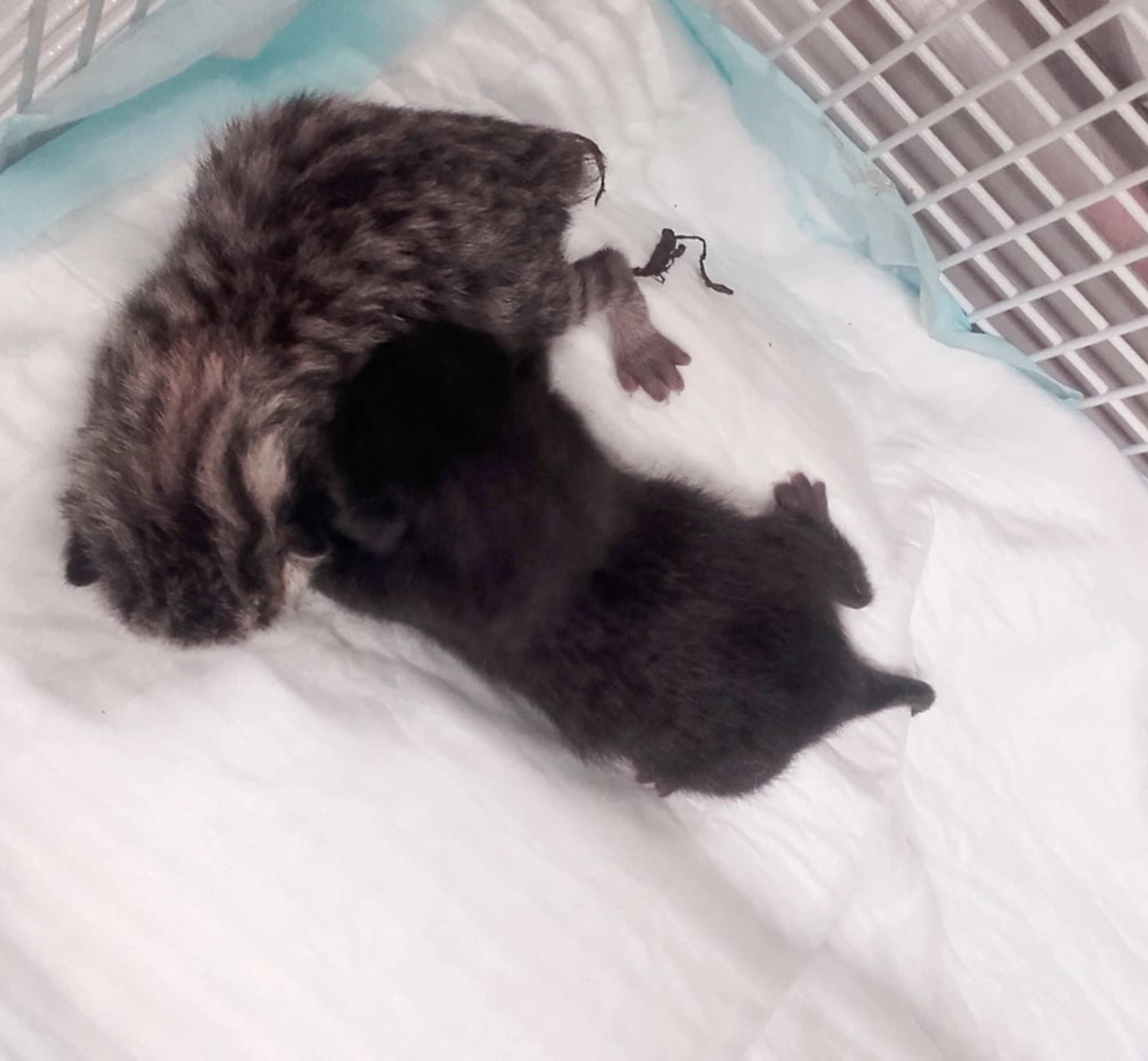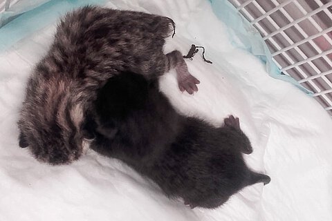 Schnell erreichten wir den „Einsatzort“: Es stellte sich dort sofort heraus, dass die beiden Katzenkinder erst zwei Tage alt waren. Ihre Nabelschnur war noch nicht abgefallen, ihre Augen und Ohren waren auch noch geschlossen. Eine der beiden Welpen war außerdem schwer verletzt, ihr rechtes Vorderbeinchen und das Schwänzchen waren abgerissen und haben großen Wunden hinterlassen. Nach der Erstversorgung brachten wir beide Kätzchen umgehend in die Chirurgische Abteilung der Uniklinik München. Dort wurden in einer Operation die Abrisswunden versorgt, und es wurde sichergestellt, dass die Kleinen auch ohne ihr Muttertier bestmöglich mit adäquater Aufzuchtnahrung gepäppelt, gewärmt und gepflegt werden. Sobald die Welpen wieder gesund sind, werden sie an das Tierheim Riem übergeben und dort zur Vermittlung freigegeben. Wir wünschen sehr, dass die Kleinen nach einem so schweren Start ins Leben nun ein gemütliches und liebevolles Zuhause finden.