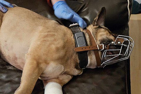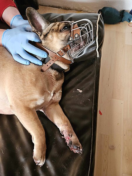 Sie lief sofort nach Hause und versuchte, die Pfote zu verbinden, war jedoch aufgrund der großen Blutmengen sehr aufgeregt und hilflos und rief die Tierrettung München an. Sie hatte währenddessen bereits einen Druckverband angelegt. Dieser stillte die Blutung, weshalb sie den Einsatz zunächst wieder stornierte und den Hund bei ihrer Haustierärztin vorstellen wollte. Leider hatte diese keine Zeit und empfahl aufgrund der Beschreibung der massiven Blutung eher einen Besuch in einer Tierklinik. Die Besitzerin hatte jedoch kein Auto und musste zur Arbeit. Deshalb rief sie erneut bei uns an und bat um einen Besuch mit möglichem Kliniktransport. Daraufhin machten wir uns zu Gumball auf den Weg. Auf dem Weg zur Haustür sahen wir schon viele blutige Pfotenabdrücke, denen wir bis in die Wohnung folgen konnten. Auch dort waren zahlreiche blutige Abdrücke zu finden. Da Gumball nicht besonders positiv auf Tierärzte zu sprechen ist, wurde ihm ein Maulkorb angelegt. Eine Erstuntersuchung der Herz-Kreislauf-Parameter wurde durchgeführt. Beim Versuch, die Pfote zu untersuchen, war Gumball so gestresst, dass wir beschlossen, ihm zunächst ein Schmerzmittel zu verabreichen, das auch einen sedierenden Effekt hatte. Danach konnten wir die Pfote untersuchen.