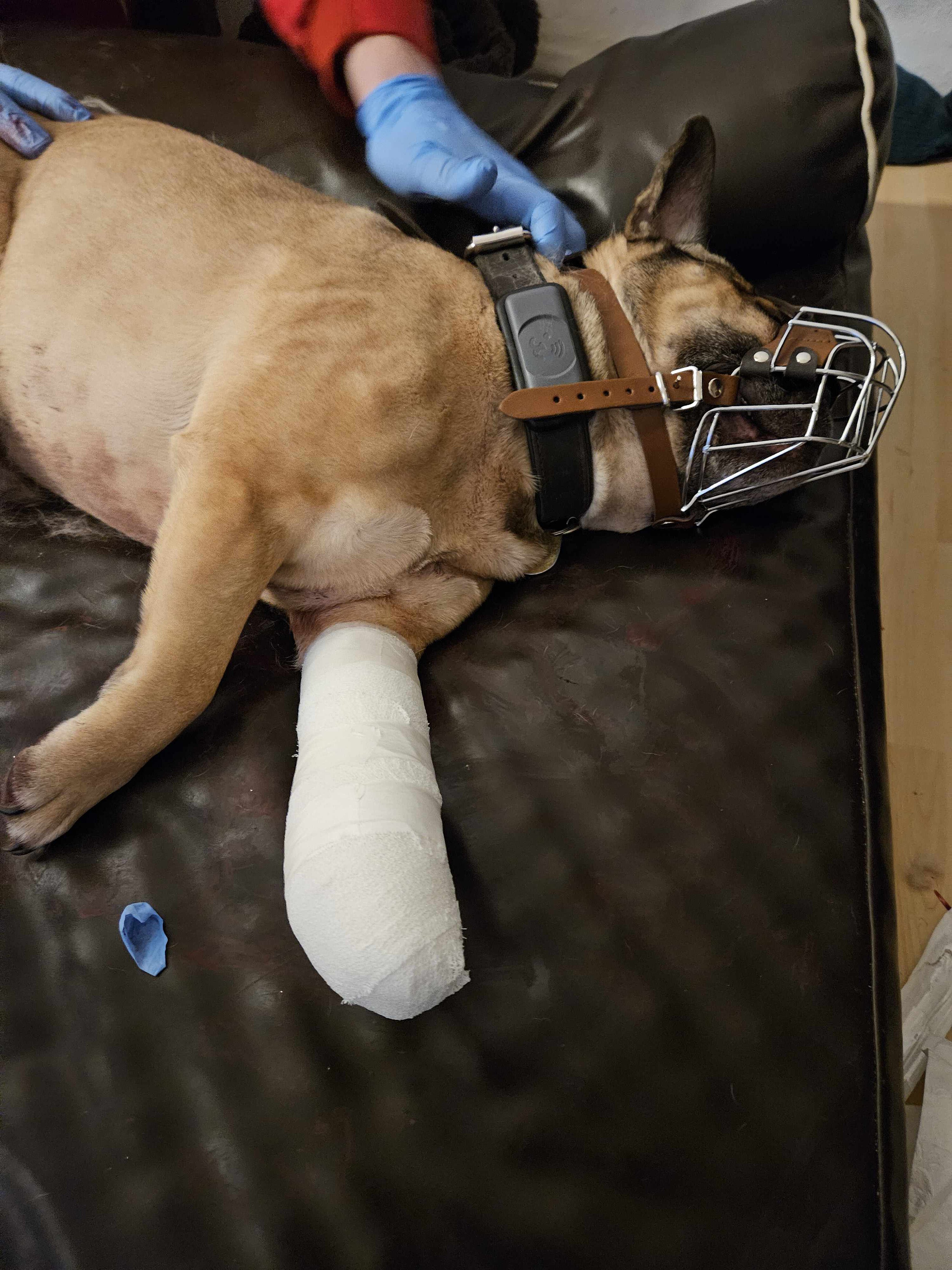 Im März wurden wir zu einer französischen Bulldogge gerufen, die stark aus der Pfote blutete. Die Besitzerin war mit „Gumball“ spazieren, als er plötzlich aus dem Gebüsch mit einer stark blutenden Pfote kam.