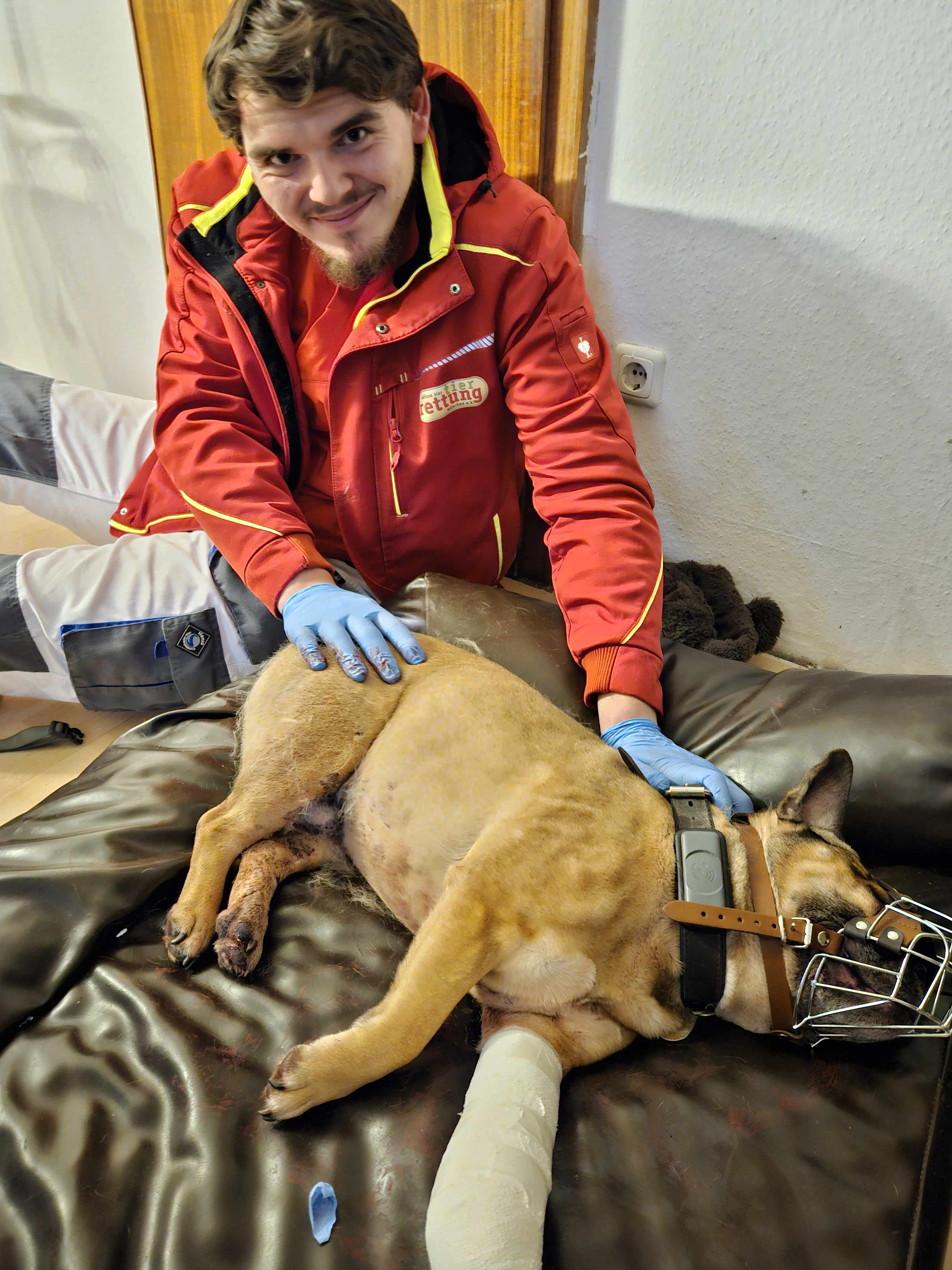 Die einzige Möglichkeit, die ich vor Ort noch sah, war ein medikamentöser Versuch, die Blutung zu stoppen. Nach Rücksprache mit der Tierklinik applizierten wir lokal Adrenalin auf die blutende Stelle. Zusätzlich spülten wir die Wunde vorsichtig und übten weiterhin Druck aus. Nach einiger Zeit kam die Blutung zum Stillstand. Wir legten einen erneuten Druckverband an und ließen den Besitzern Verbandsmaterial für einen späteren Wechsel da. Sie sollten die Wunde kontrollieren, sobald die Besitzerin von der Arbeit zurück ist, und gegebenenfalls eine Tierklinik aufsuchen, falls die Blutung wieder einsetzt. Der Hund erhielt zudem eine Antibiose und Schmerzmittel, da die Pfählungsverletzung in Gelenknähe lag und ich eine Infektion ausschließen wollte. Es wurde empfohlen, den Hund am nächsten Tag bei der Haustierärztin vorzustellen und ihn bis dahin möglichst ruhig zu halten.