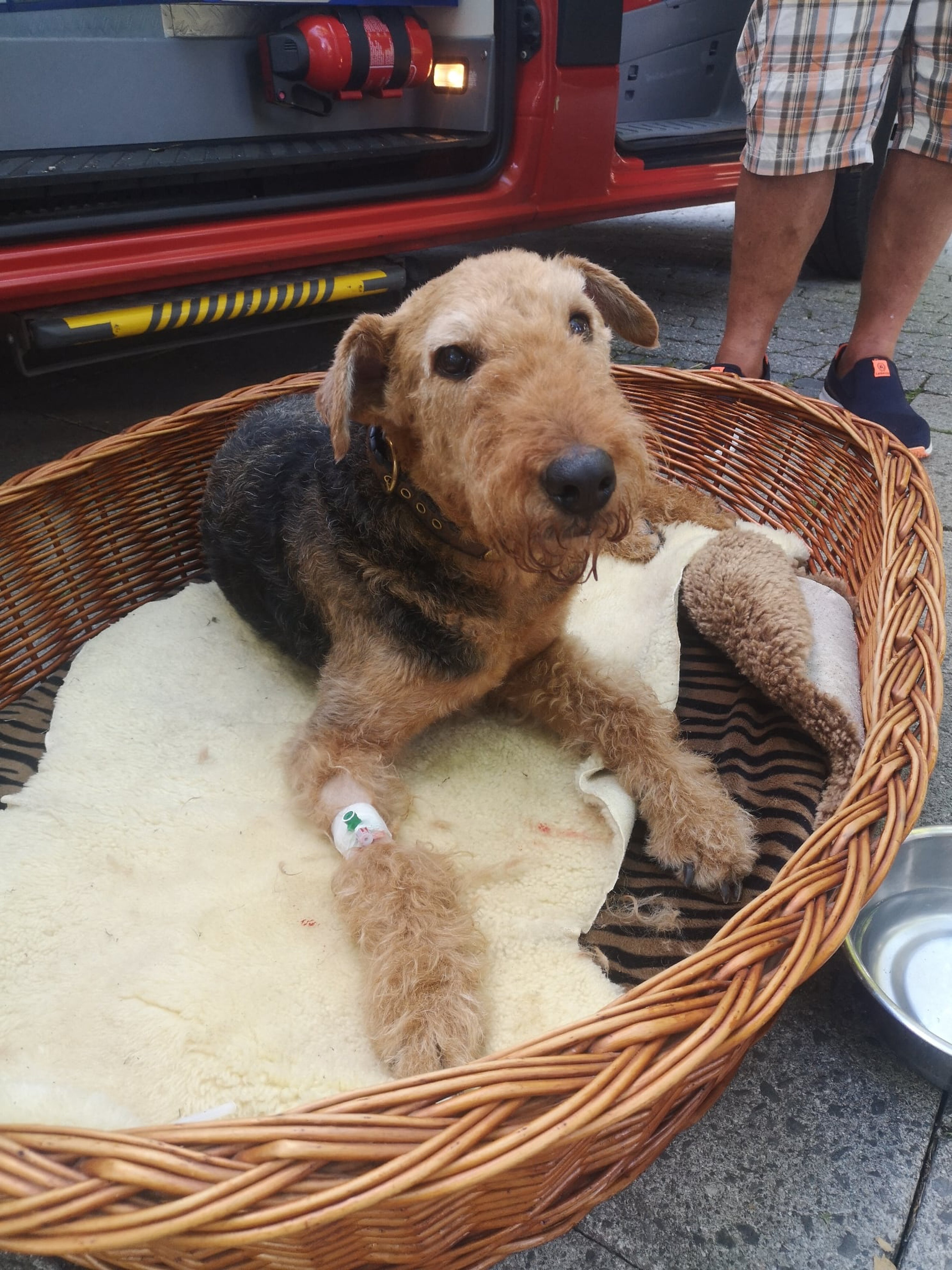 Während des Transportes erhielt der Terrier außerdem noch eine Infusion, um den Kreislauf, insbesondere den Blutdruck, aufrechtzuerhalten. Immer wieder schlief der Hund fest ein, konnte aber durch Rufen wieder aufgeweckt werden. In der Klinik war er schon etwas sicherer auf den Beinen, auch wenn er immer etwas zum Anlehnen suchte. Bragi hat die Nacht in der Tierklinik gut überstanden, und wir drücken ihm alle Daumen, dass er keine bleibenden Schäden davonträgt und nun noch ein gutes Leben bei seiner neuen Besitzerin hat.