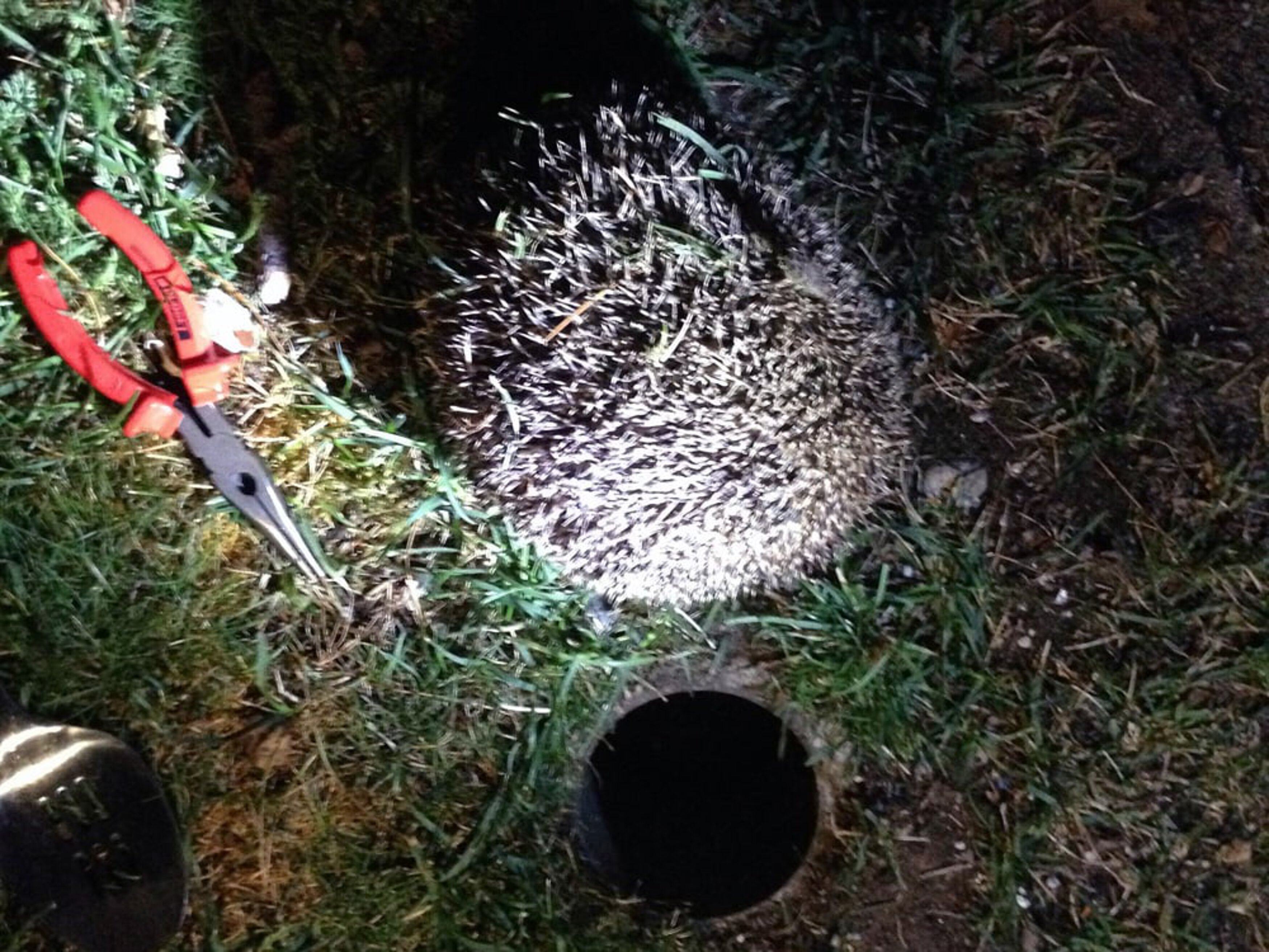 Der diensthabende Tierarzt Mathias Beyer und seine Assistentin fuhren sofort los. Am Einsatzort angekommen, stellten sie fest, dass es sich bei dem vermeintlichen Stachelschwein um einen Igel handelt, der in einem etwa 30 Zentimeter tief in den Boden eingelassenen Stahlrohr steckte, das wohl normalerweise für die Befestigung von Absperrpfosten dient – wie sie beispielsweise bei Rettungseinfahrten zu finden sind. Die Bergung des eingeklemmten Tieres erwies sich für die Tierretter als schwierig. Die Stacheln des Igels hatten sich wie Widerhaken an den Rohrwänden verkeilt. Zunächst versuchten der Tierarzt und seine Assistentin, das Tier mit einer Klemme zu befreien. Doch dies funktionierte nicht. Auch der Versuch, das Tier mit einem Löffel aus seinem Gefängnis herauszuheben, scheiterte. Um den Igel nicht weiter zu stressen, verabreichte ihm der Veterinär schließlich ein Ultrakurznarkotikum. Der Plan war, den Igel damit zu entspannen und ihn so leichter bergen zu können.