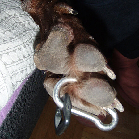 Die Hundebesitzerin alarmierte sofort die Tierrettung. Als der diensthabende Tierarzt Dr. med.vet. Gabor Horvath am Einsatzort in der Keferstraße (Nähe Seehaus) eintraf, sah er sofort, dass der Hund unter großen Schmerzen litt. Der Veterinär legte einen venösen Zugang und verabreichte Mora ein starkes Schmerzmittel. Weil er jedoch vermutete, dass der Karabiner die Haut zwischen den Zehen durchtrennt hat, wollte er das Tier nicht vor Ort in Narkose legen, sondern es lieber gleich in die Kleintierklinik der Ludwig-Maximilians- Universität zum Entfernen des Fremdkörpers bringen. Doch als sich Mora sichtlich beruhigte, die Schmerzen durch das Medikament nachließen, gab Dr. Horvath den Kampf um das gesunde Bein des Tieres nicht auf. Es gelang ihm noch vor Ort, den Fremdkörper aus der gesunden Pfote zu entfernen. Zum Glück hatte sich sein Anfangsverdacht nicht bestätigt: Der Karabiner hatte die Haut zwischen den Zehen nicht durchbohrt, sondern nur stark gequetscht. Die einzige gesunde Vorderpfote, die Mora besitzt, konnte also gerettet werden. Der Spaziergang war damit zwar beendet, aber die glückliche Hundebesitzerin konnte ihren verletzten Liebling aber wieder mit nach Hause nehmen. Auch die Gründerin und Vizepräsidentin der Tierrettung, Dr. Evelyne Menges, ist glücklich über die Rettung der Hündin: „Als Hundebesitzerin weiß ich nur allzu gut, wie es einem geht, wenn es dem geliebten Tier schlecht geht und es dringend Hilfe benötigt. Deshalb habe ich vor mittlerweile zwölf Jahren die Tierrettung ins Leben gerufen. Die rund 4000 Einsätze im Jahr zeigen auch, wie wichtig diese Institution in München geworden ist. Ich würde mir wünschen, dass auch in anderen Städten ein ambulanter Notfalldienst eingerichtet wird. Ein Fall wie der von Mora bestätigt mich darin, weiter am Ausbau unserer Organisation zu arbeiten – hätte Dr. Horvath nicht so beherzt reagiert, wäre die gesunde Pfote des Tieres wohl kaum zu retten gewesen“.