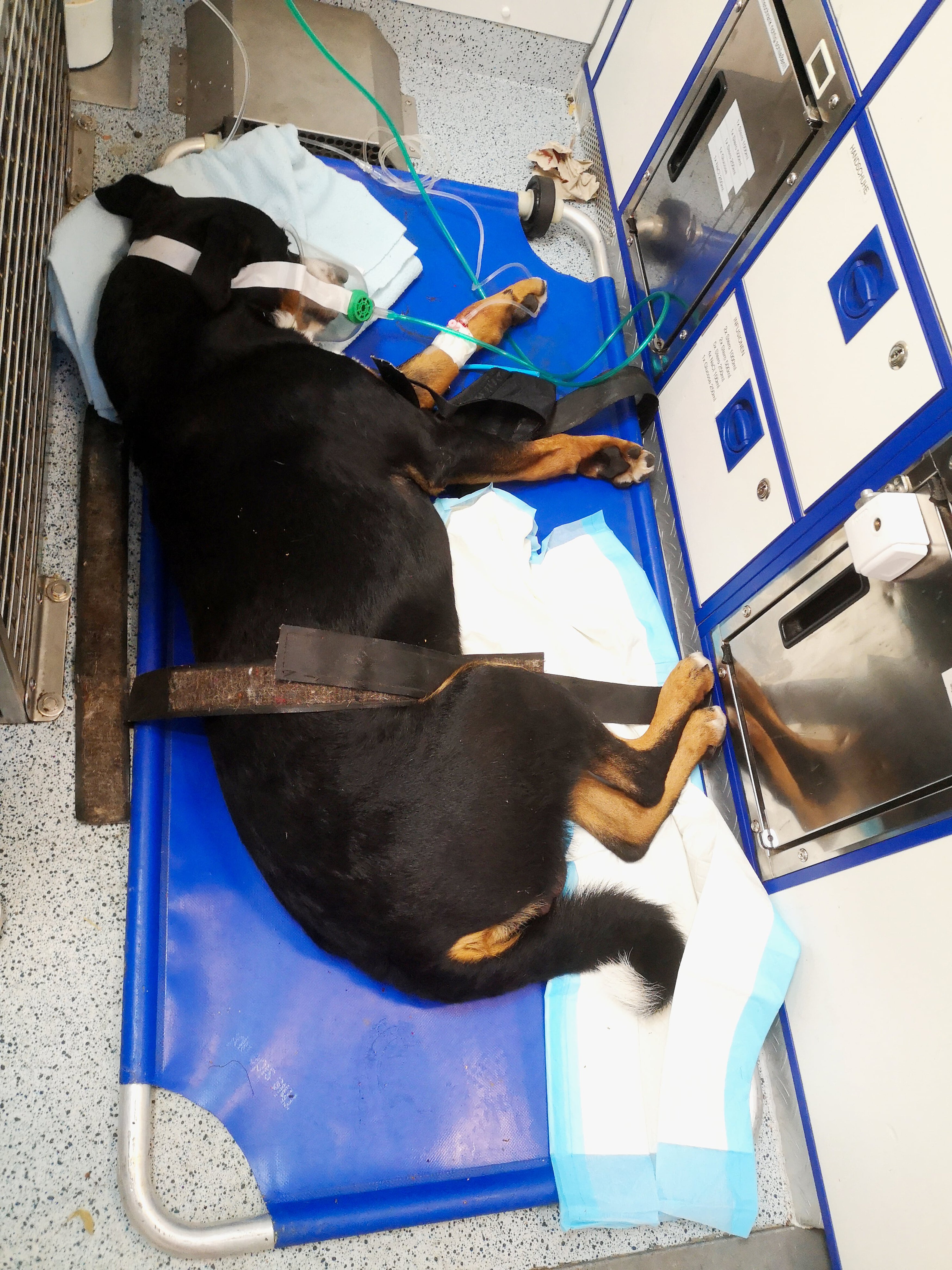 Warum der Hund Apollo in dieser Nacht aus dem 4. Stock gesprungen oder gefallen ist, werden wir wohl niemals erfahren. Allerdings zeigte die Untersuchung vor Ort schwere Verletzungen. In der klinischen Untersuchung wurde eine erhöhte Atemfrequenz festgestellt, die unter anderem auf Schmerzen oder ein Lungentrauma hinweisen kann. In der neurologischen Untersuchung waren unterschiedlich große Pupillen auffällig, was auf ein Schädel-Hirn-Trauma hindeuten kann. Eine Fraktur an der Vordergliedmaße konnte ebenfalls sicher identifiziert werden. Außerdem bestand der Verdacht auf eine schwere Verletzung an den Hintergliedmaßen, des Beckens oder der Wirbelsäule.