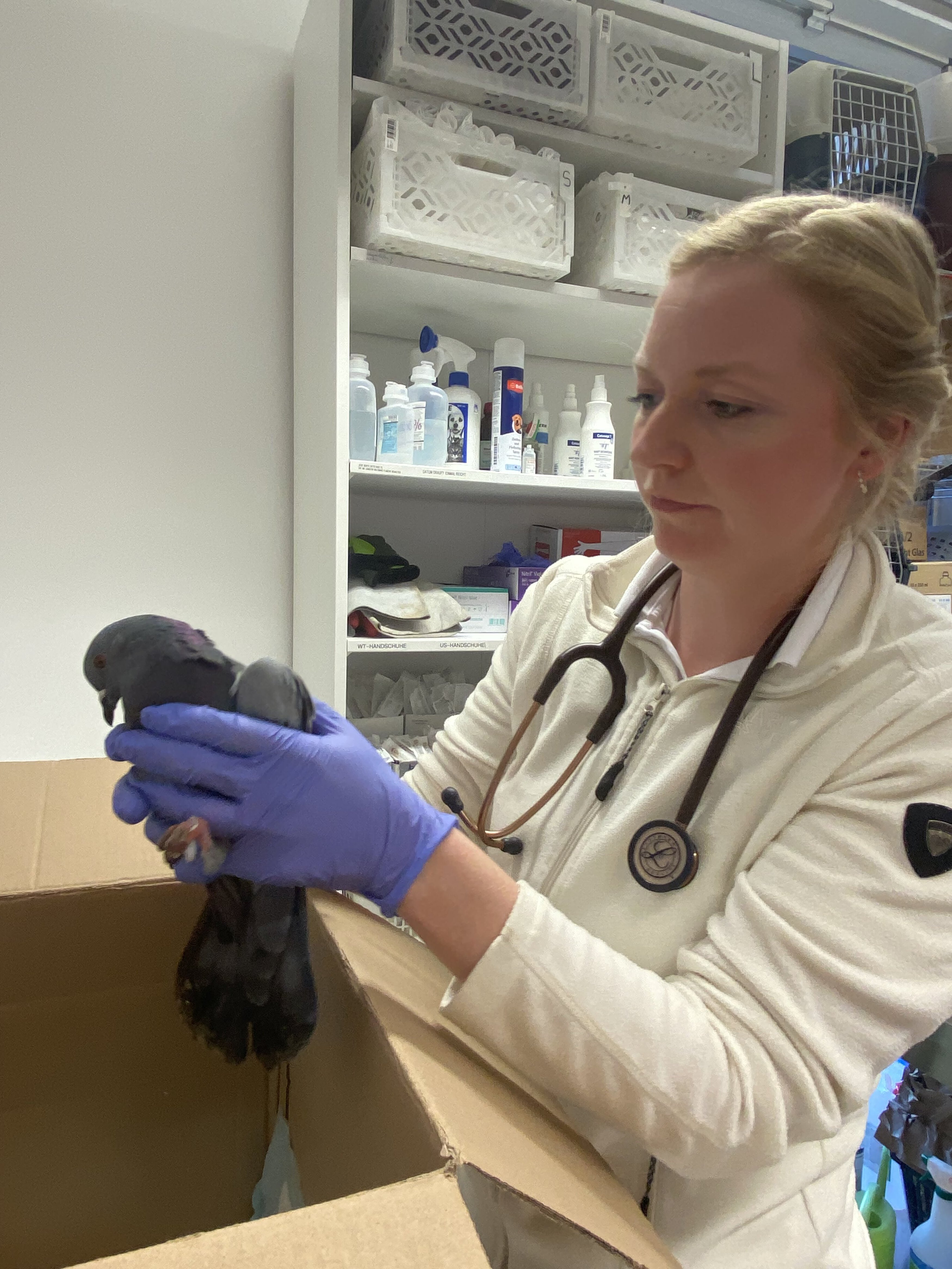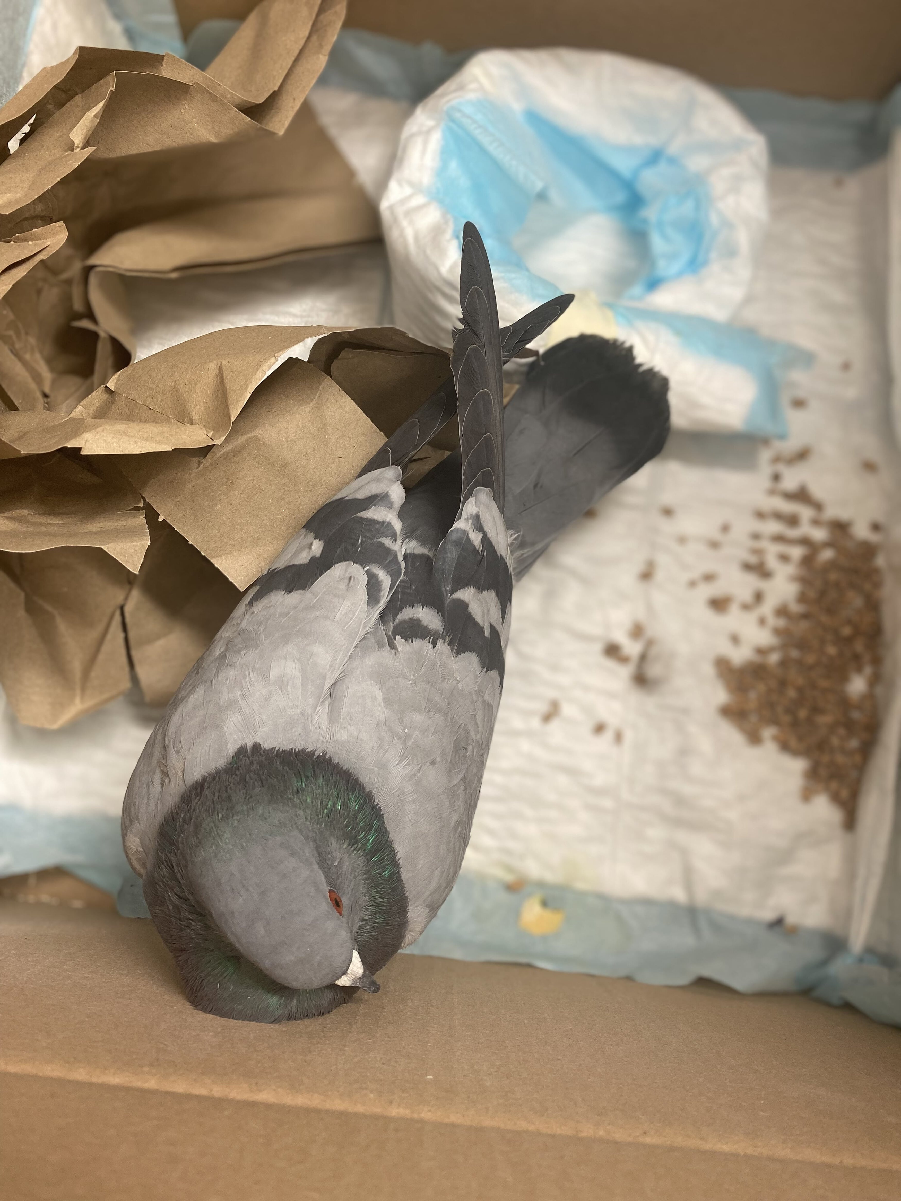 Es klingelte immerzu das Telefon, und manches konnte telefonisch erledigt werden. Natürlich sitzt man, wenn es keinen Einsatz gibt, dann nicht gemütlich bei einem Tässchen Kaffee, sondern versorgt vorhandene Vögel, bildet sich weiter, spricht über interessante Fälle und schreibt ausführliche Einsatzprotokolle. Diese detaillierten Protokolle sind wichtig für Nachfragen und auch für einen danach weiterbehandelnden Arzt. In einem großen Karton erholte sich inzwischen eine gebrachte Taube, die nicht mehr fliegen konnte und immer umkippte. Sie erholte sich langsam nach medizinischer Versorgung, trank Wasser und stärkte sich mit Körnchen. Vielleicht kann sie bald wieder losfliegen.
