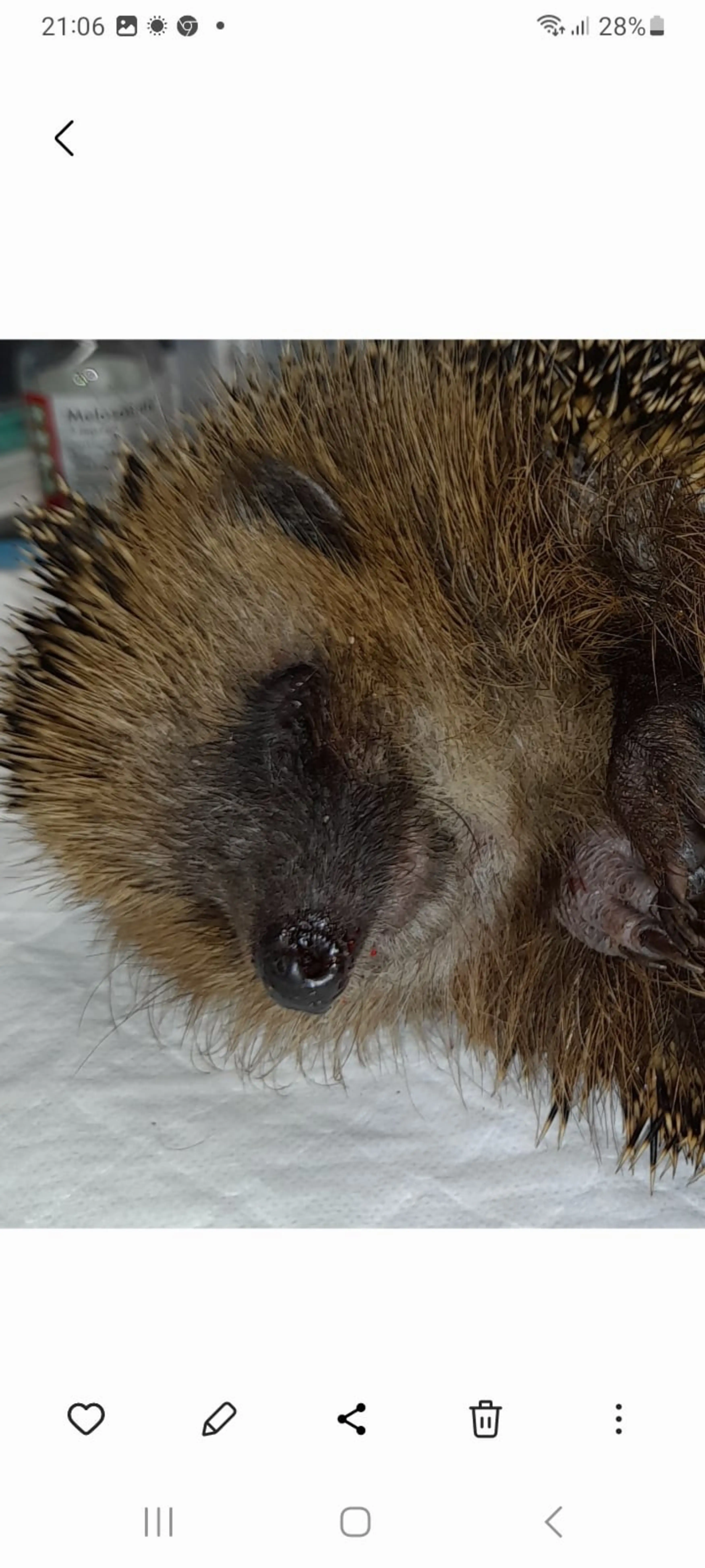 Bei der Allgemeinuntersuchung stellten wir eine eitrige Augen- und Nasenentzündung fest. Der Igel war apathisch und in einem schlechten Allgemeinzustand. Er bekam nach langsamem Aufwärmen von uns Antibiotikum, Schleimlöser und Vitamin B gespritzt sowie eine Infusion und Augentropfen. Er blieb aus logistischen Gründen ausnahmsweise zwei Tage bei uns statt wie sonst üblich einer Nacht. In der Zeit besserte sich sein Allgemeinbefinden etwas. Am zweiten Tag hatte er mehr Appetit und war munterer. Wir brachten ihn ins Tierheim und erkundigten uns nach einiger Zeit nach ihm. Leider erfuhren wir, dass sich sein Zustand zwar gebessert hatte, er aber nach zwei Wochen leider doch überraschend verstarb.