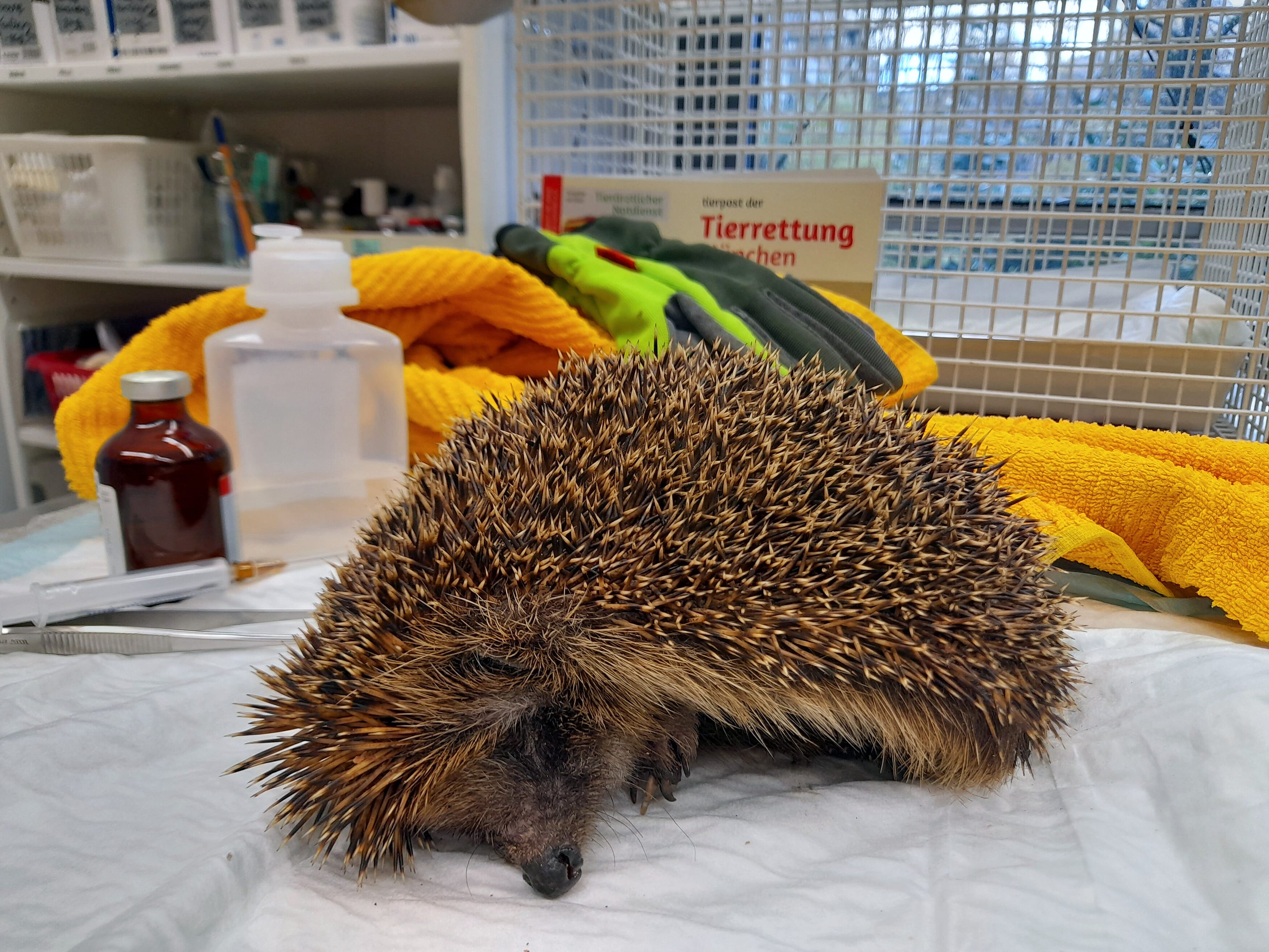 Durch Autos oder Fahrräder angefahrene Igelpatienten werden uns das ganze Jahr hindurch gebracht. Wenn sie nicht direkt von den Unfallverursachern gebracht werden, kann nur eine Verdachtsdiagnose gestellt werden, da die Folgen und Symptome sehr unterschiedlich sein können und die Untersuchungsmöglichkeiten bei Igeln eingeschränkt sind. Im Mai wurde uns ein Igel gebracht, der abends in der Nähe vom Fahrradweg gefunden wurde. Er war unterkühlt und konnte sich nicht vollständig einrollen. Äußere Verletzungen waren nicht auffindbar. Wir führten eine Notfallbehandlung durch.