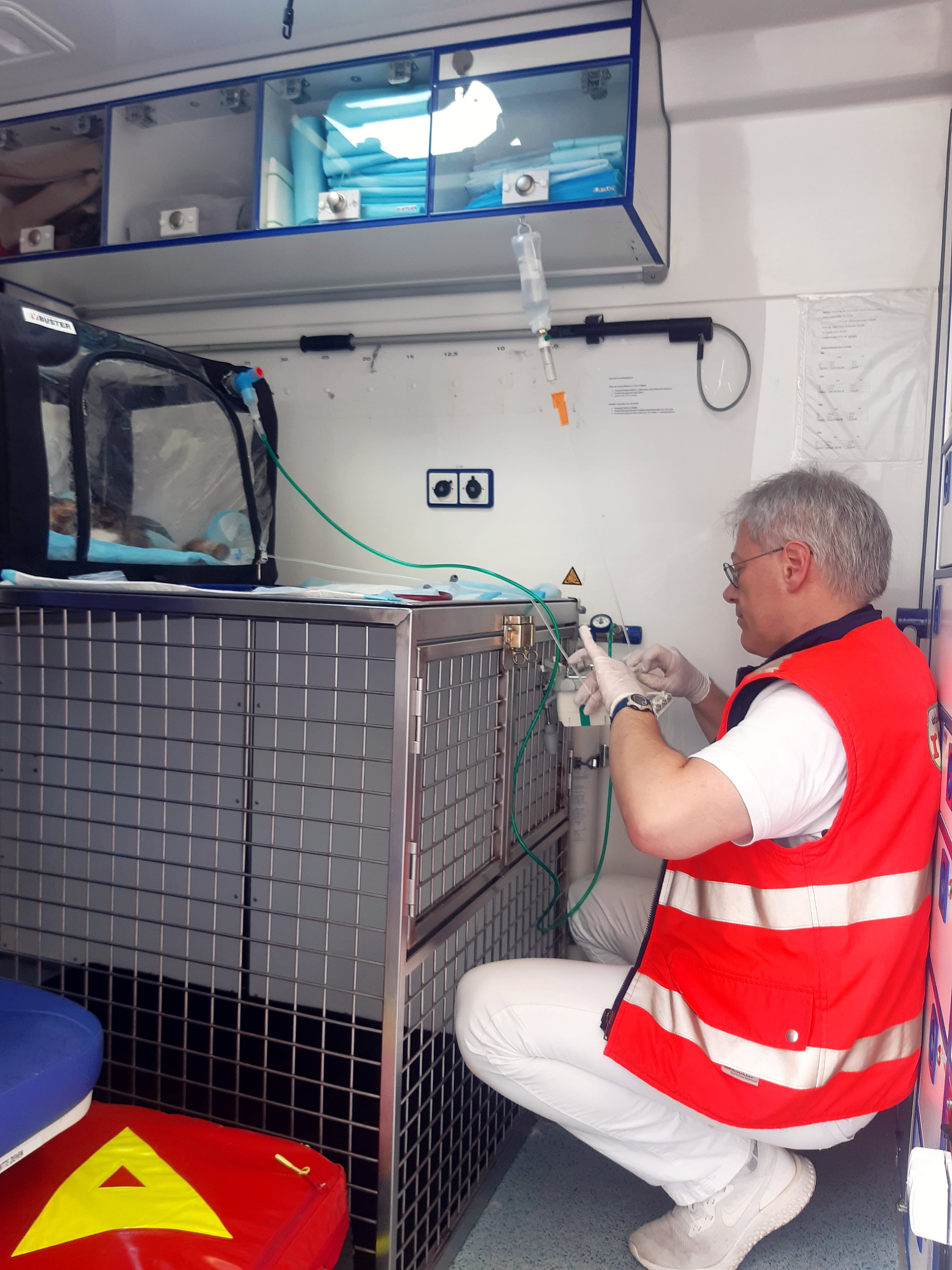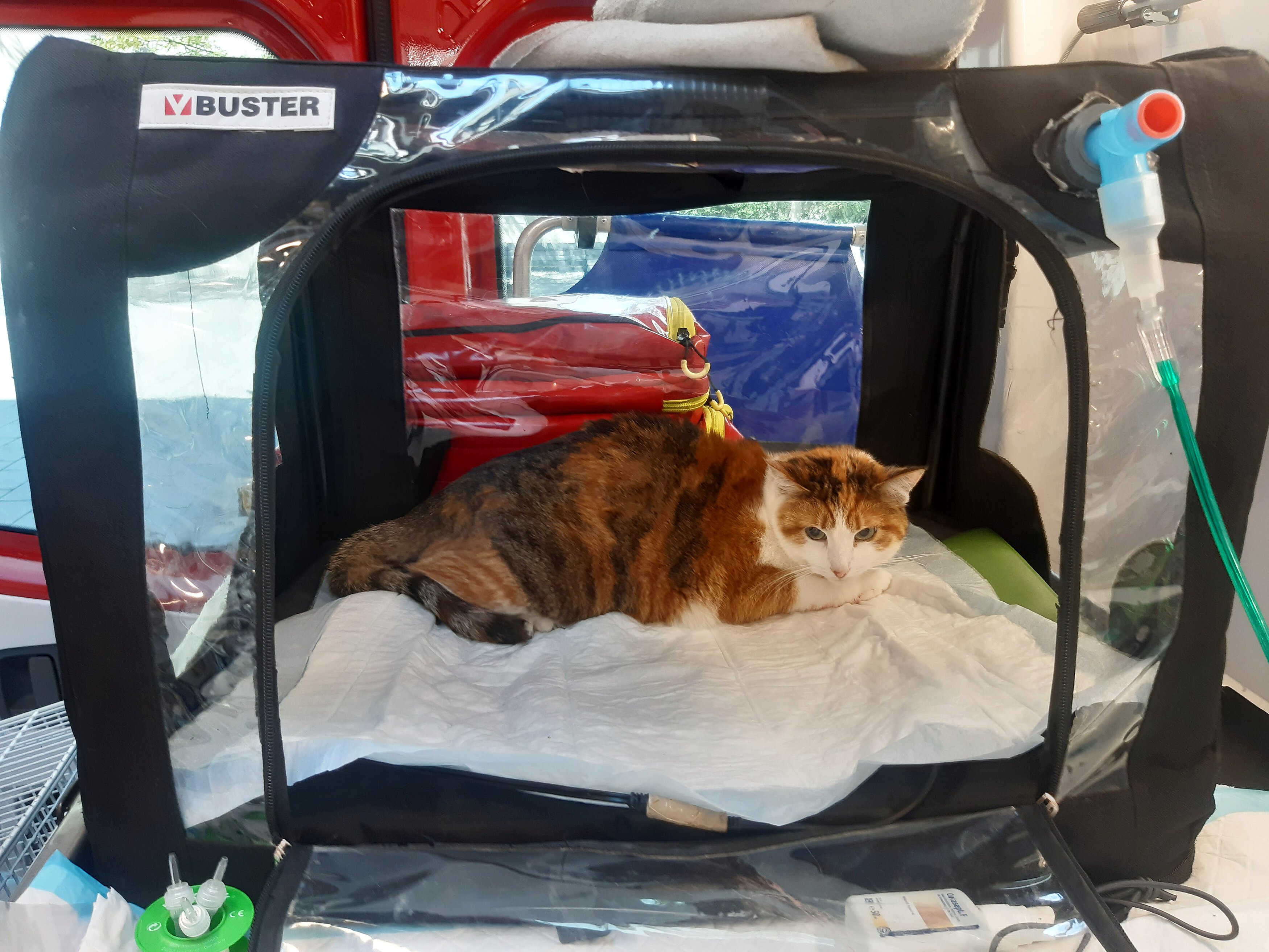 Die Patientin bekam von uns sofort ein starkes Schmerzmittel, Sauerstoff und einen venösen Zugang. Nach der Blutentnahme für die Untersuchung in der Klinik schlossen wir sie an eine Infusion an. In der Zwischenzeit hatte Tasso unseren Anruf beantwortet. Die Katze war zum Glück bei ihnen registriert. Sie nahmen unsere Kontaktdaten auf, damit sich der Besitzer bei uns und der Klinik melden konnte.