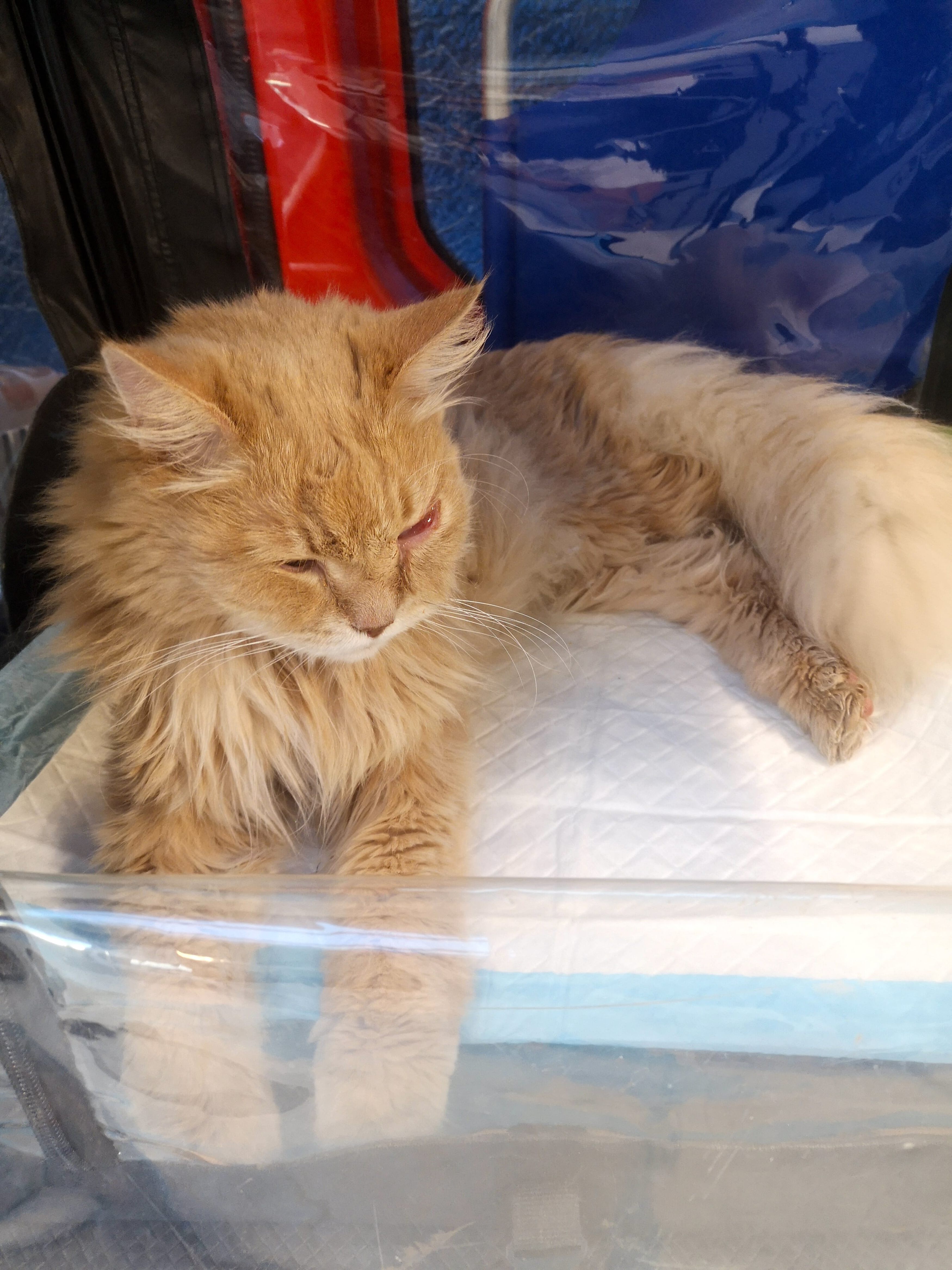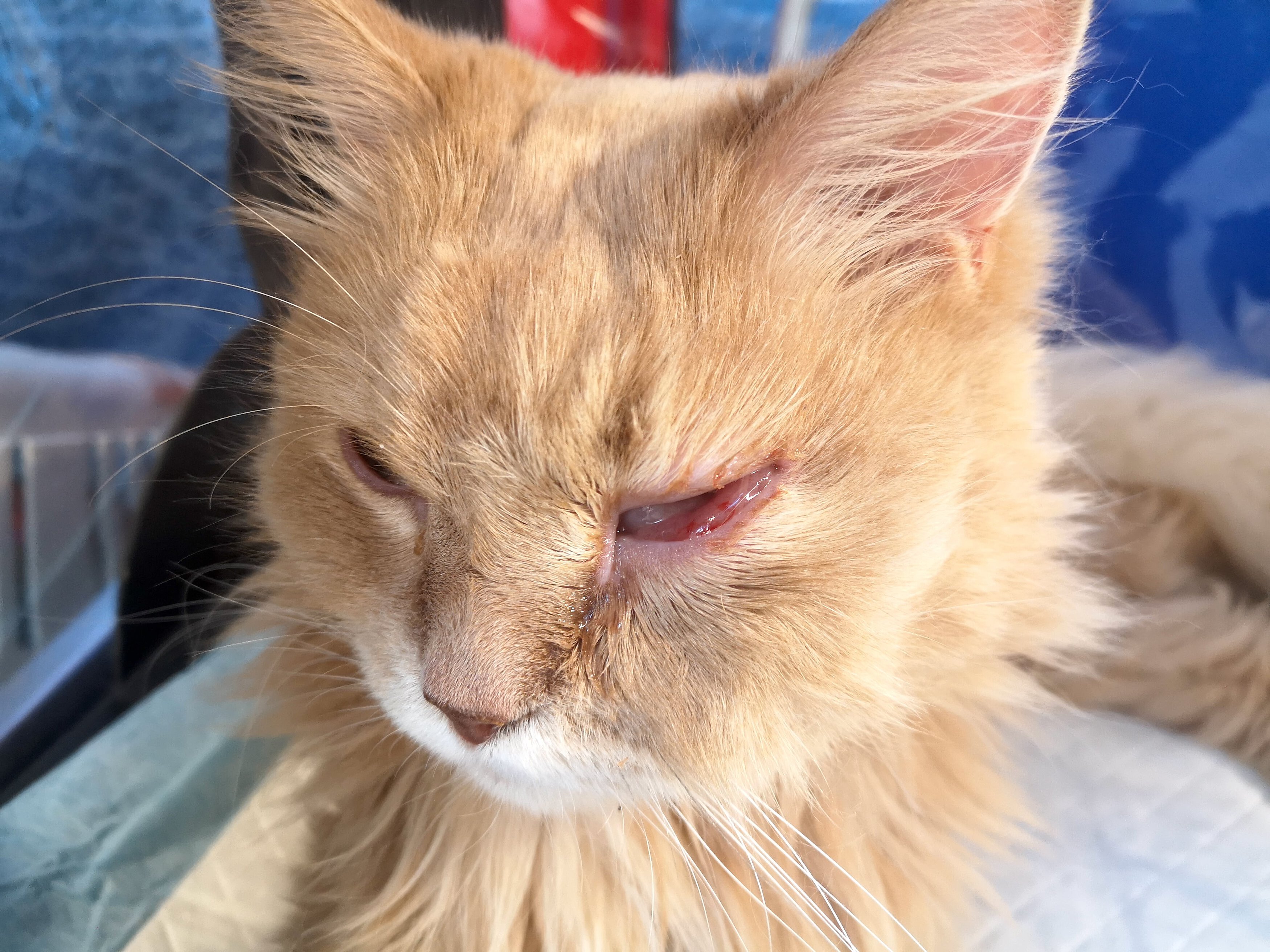 Leider war das Auge offenbar sehr schmerzhaft, und ich habe eine hochgradige Schwellung in diesem Ausmaß selbst noch nie gesehen. Da ich den Augapfel selbst nicht einsehen konnte, konnte auch nicht beurteilt werden, ob dieser intakt war. Aufgrund der hochgradigen Schwellung erging mein Rat zu einer Vorstellung in einer Tierklinik bei einem Augenspezialisten. Alternativ hätten wir einen Versuch mit einem Lokalanästhetikum unternommen, um eine genauere Beurteilung des Zustandes zu versuchen. In diesem Ausmaß aber sicherlich mit einem Risiko ohne weitere Diagnostik verbunden. Die Besitzer entschieden sich für einen Transport in die Tierklinik.