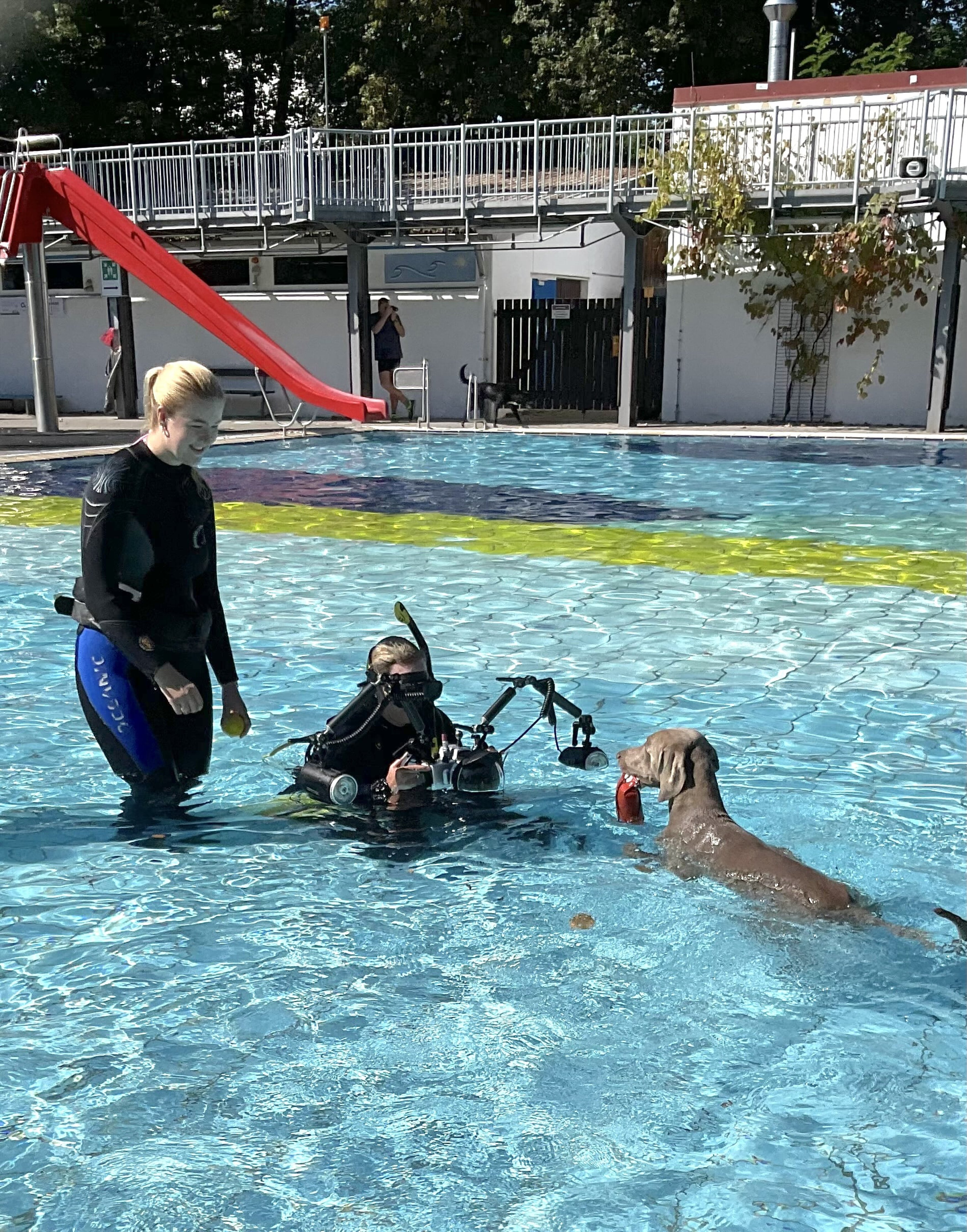 Ein besonderes Highlight war die Teilnahme des Teams des Divingcenters Tauchsucht (www.tauchsucht.net). Taucher mit professionellen Unterwasserkameras schossen Tausende von Fotos von springenden, schwimmenden und tauchenden Hunden. Die Hunde wurden von den feißigen Helfern Silvia, Josephine, Jana und Toni der Tauchschule animiert, damit sie dem Unterwasserfotografen Alex Weinberger und seiner Lebensgefährtin Angi Holzhammer auch gut vor die Linse kommen, die lachend berichteten, dass die Hunde unter Wasser offene Augen haben und aus ihren Nasen Luftblasen hochsteigen. Es war sehr lustig zu sehen, mit welchen Gebärden und Worten die Hunde motiviert wurden, um zum Fotografen zu schwimmen oder zu springen. Dieser herrliche sonnige Sonntag mit den fröhlichen Menschen und Tieren bleibt unvergesslich bis zum nächsten September, wenn das Bad wieder zum Hundeplantschen einlädt.