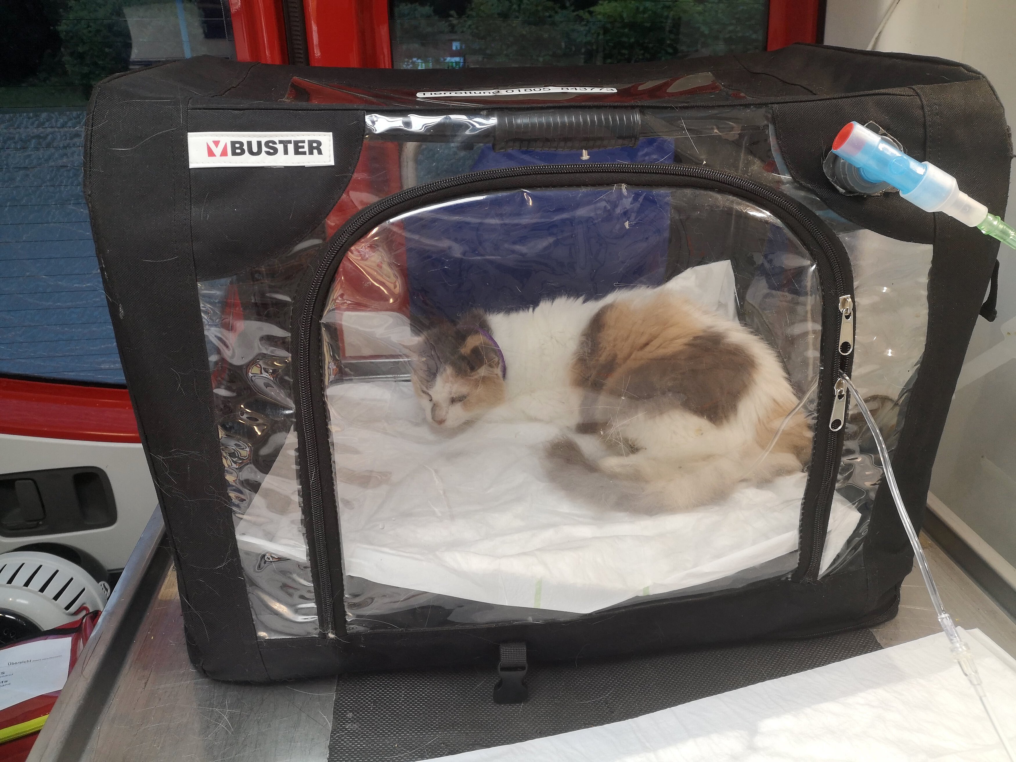 Bei unserem Eintreffen stellten wir zunächst erleichtert fest, dass die Patientin noch laufen konnte. Dennoch gab ihr Zustand Grund zur Sorge. Eine sehr hohe Körpertemperatur von 40,1 Grad Celsius konnte gemessen werden. Für einen Fenstersturz typisch, konnte man an Callies Zunge eine kleine EinbissStelle und an ihrer Lippe ein Hämatom finden. Zudem war einer ihrer Zähne im Oberkiefer abgebrochen. Besonders kritisch war die hohe Atemfrequenz der Katze zu beurteilen. Bei etwa 100 Atemzügen pro Minute lag diese deutlich über der Normfrequenz von bis zu 40 Atemzügen pro Minute. Beim Einatmen konnte man zudem ein deutlich verschärftes Atemgeräusch hören.