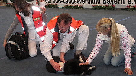 Nachdem ich nun (ohne Hund) die vielen Angebote betrachtet, die Bücher entdeckt und ein neues – trachtiges – Hundegeschirr gekauft hatte – war die Zeit gekommen, den Auftritt der Tierrettung München im Rund der Halle anzusehen. In der Arena der Olympiahalle wurde eine Einfahrt für gestellt, der dann mit eingeschalteten Scheinwerfern langsam einfuhr, an Bord waren der Tierarzt Daniel Prengel und ein Tierarztassistent. Die Moderation erfolgte durch Tierarzt Dr. Wendt. In der Mitte der Arena liegt nun ein beim Autounfall „verletzter“ Hund, ein Boarder Collie, daneben kniet sein Frauchen. Als erstes erfolgt vom Arzt eine schnelle Kontrolle des Hundes auf stark blutende Wunden – sie sind glücklicherweise nicht vorhanden. Der Kreislauf wird untersucht durch Temperatur-Messung, Betrachtung der Schleimhäute im Maul, das Herz wird abgehört und der Puls gefühlt. Es wird die Lunge abgehört und der Bauch abgetastet. Der Arzt legt am Vorderbein einen Venenverweilkatheter, natürlich wird auch angedeutet wie das Bein desinfiziert wird. Außerdem gibt es Schmerzmittel und eine Infusion zur Kreislaufstabilisierung wird angehängt. Der Hund ist ein geduldiger Patient und scheint das Scheinwerferlicht gewöhnt zu sein. Eine fiktive Wunde findet sich am Bauch, also gibt es einen Bauchverband! Nun wird der Hund auf die Trage gelegt, ins Tierrettungs-Auto getragen und schnellstens zur Tierklinik zur weiteren Behandlung gefahren. Diese anschauliche Vorführung zeigte, wie ein Einsatz im Ernstfall ablaufen kann. Ein Dank auch an den schauspielenden Hund und sein Frauchen, sie waren ein super Team. Dr. Wendt informierte das zuschauende und interessierte Publikum über die Tierrettung München, über den 2001 gegründeten Verein und die Anzahl der Einsätze und die Notfallerstversorgung von Begleit-, Fund- und Wildtieren. Ein erster Hinweis auf die Tierrettungs-App erfolgte ebenfalls. Um vieles klüger, ging ich nun erst einmal einen Kaffee trinken. Auch diese Veranstaltung wurde durchgeführt vom Stich-Messeservice (info@messeservice-stich.de)