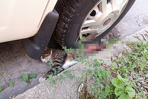 Wir machten uns auf den Weg zur angegebenen Adresse und fanden zunächst keine Katze. Dann entdeckte ich das arme Tier: Eingeklemmt zwischen den Reifen eines Transporters und dem Randstein. Schon auf den ersten Blick war zu sehen, dass die Katze sehr schwer verletzt war, aber noch lebte.