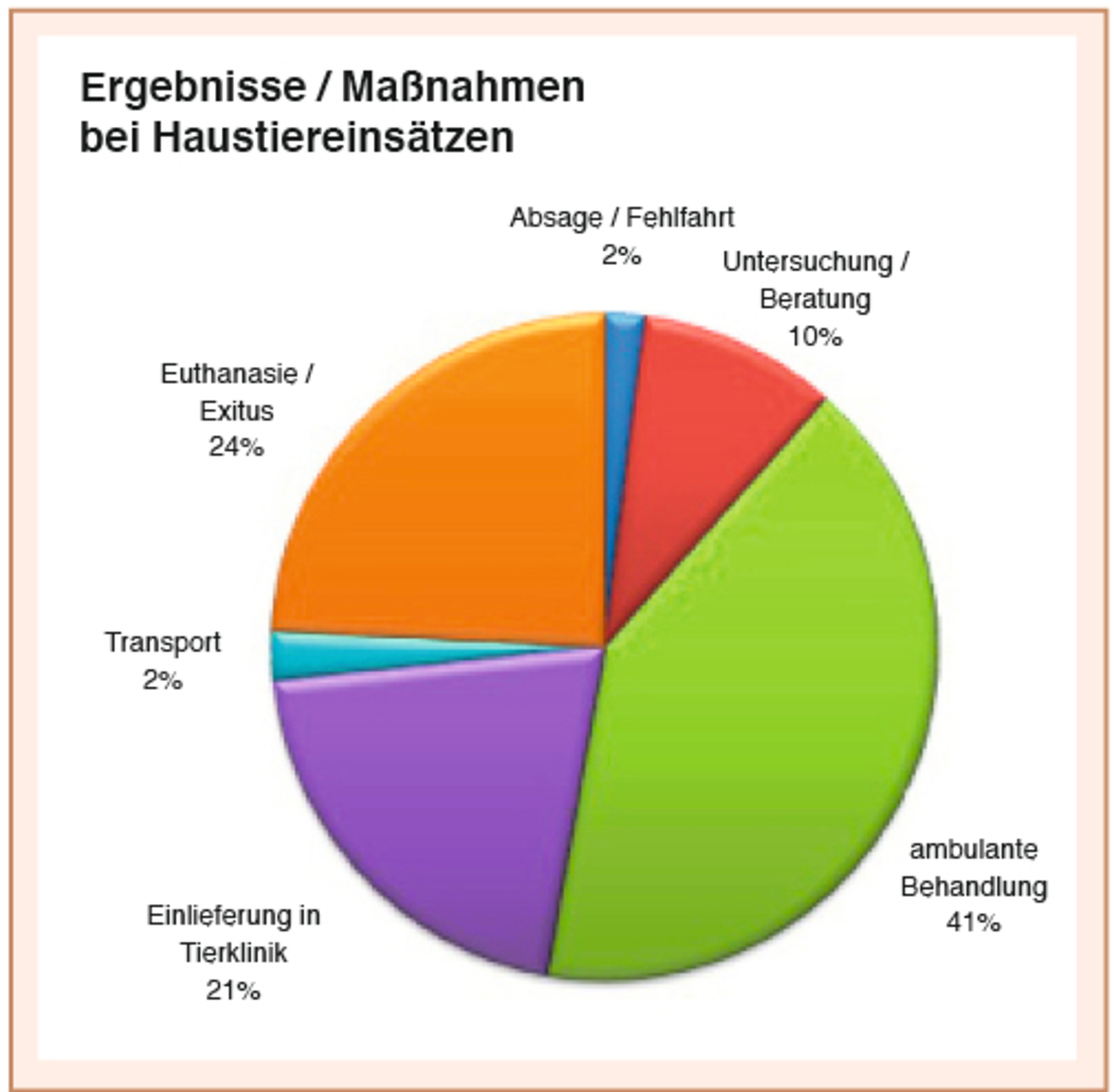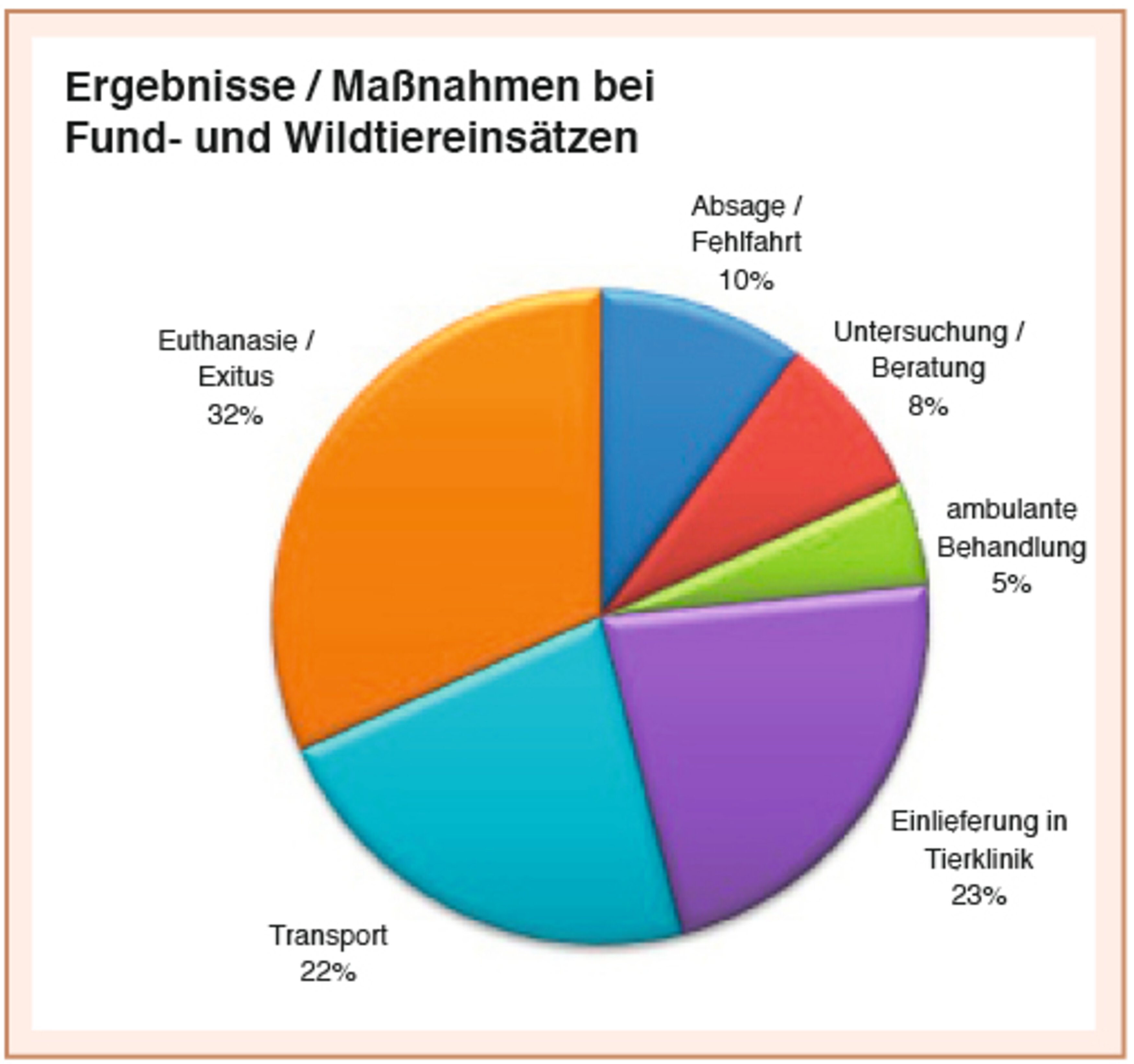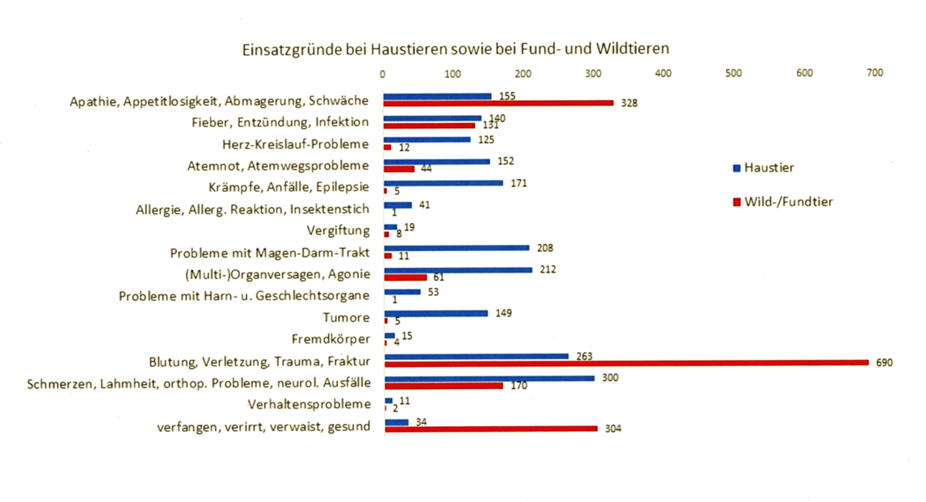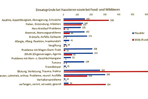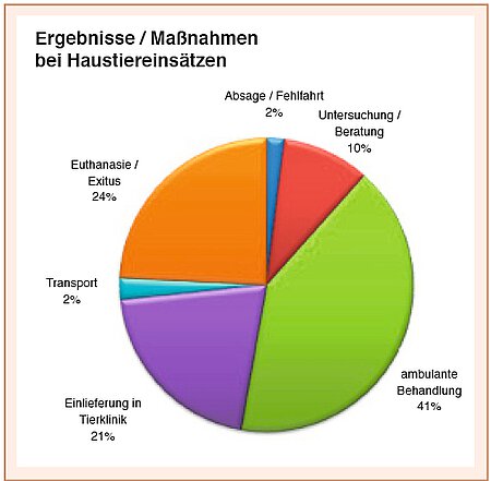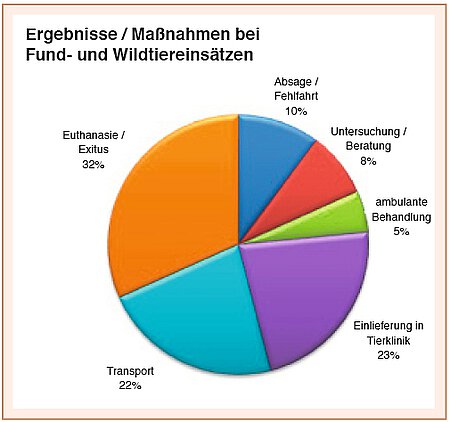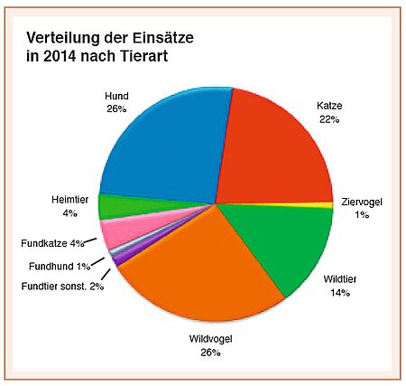 Mehr als die Hälfte der gefahrenen Rettungseinsätze fiel in den Bereich Haustiere wie Hunde, Katzen, kleine Heimtiere und Ziervögel. Die restlichen Notfälle betrafen Fundkatzen, Fundhunde und sonstige Fundtiere sowie einheimische Wildvögel und andere Wildtiere wie zum Beispiel Igel, Wildkaninchen, Eichhörnchen, Siebenschläfer, Fledermäuse, Füchse, Rehe oder sogar so seltene einheimische Tiere wie Biber aber auch Exoten wie z. B. Ibis (siehe Diagramm).